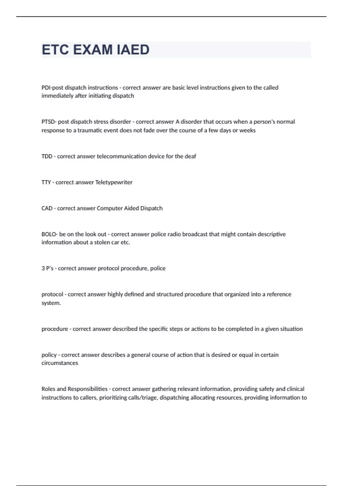 ETC EXAM IAED Question and answers 2023/2024PDI-post dispatch instructions - correct answer are basic level instructions given to the called immediately after initiating dispatch PTSD- post dispatch stress disorder - correct answer A disorder that occurs when a person's normal response to a traumatic event does not fade over the course of a few days or weeks TDD - correct answer telecommunication device for the deaf TTY - correct answer Teletypewriter