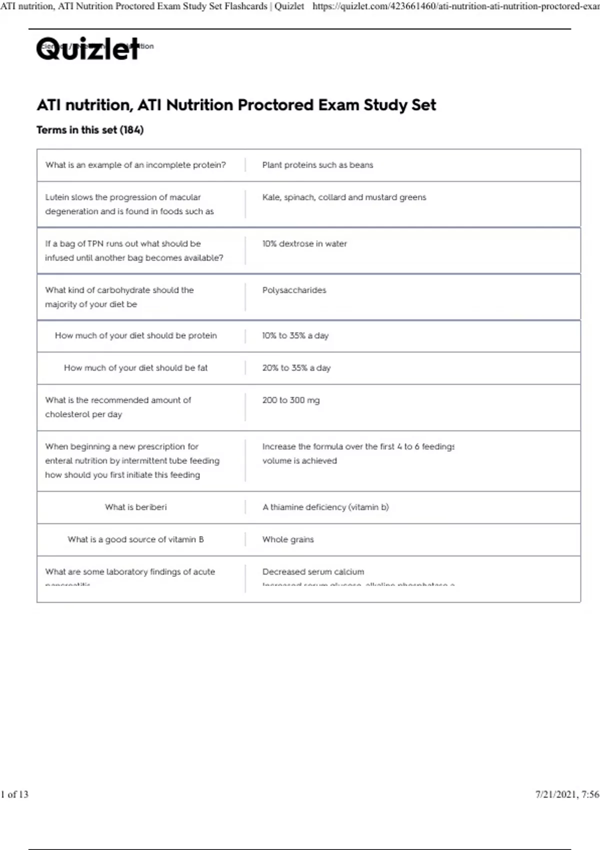 ATI nutrition, ATI Nutrition Proctored Exam Study Set Science / Medicine / Nutrition Terms in this set (184) What is an example of an incomplete protein? Plant proteins such as beans Lutein slows the progression of macular degeneration and is found in foods such as Kale, spinach, collard and mustard greens If a bag of TPN runs out what should be infused until another bag becomes available? 10% dextrose in water What kind of carbohydrate should the majority of your diet be Polysaccharides