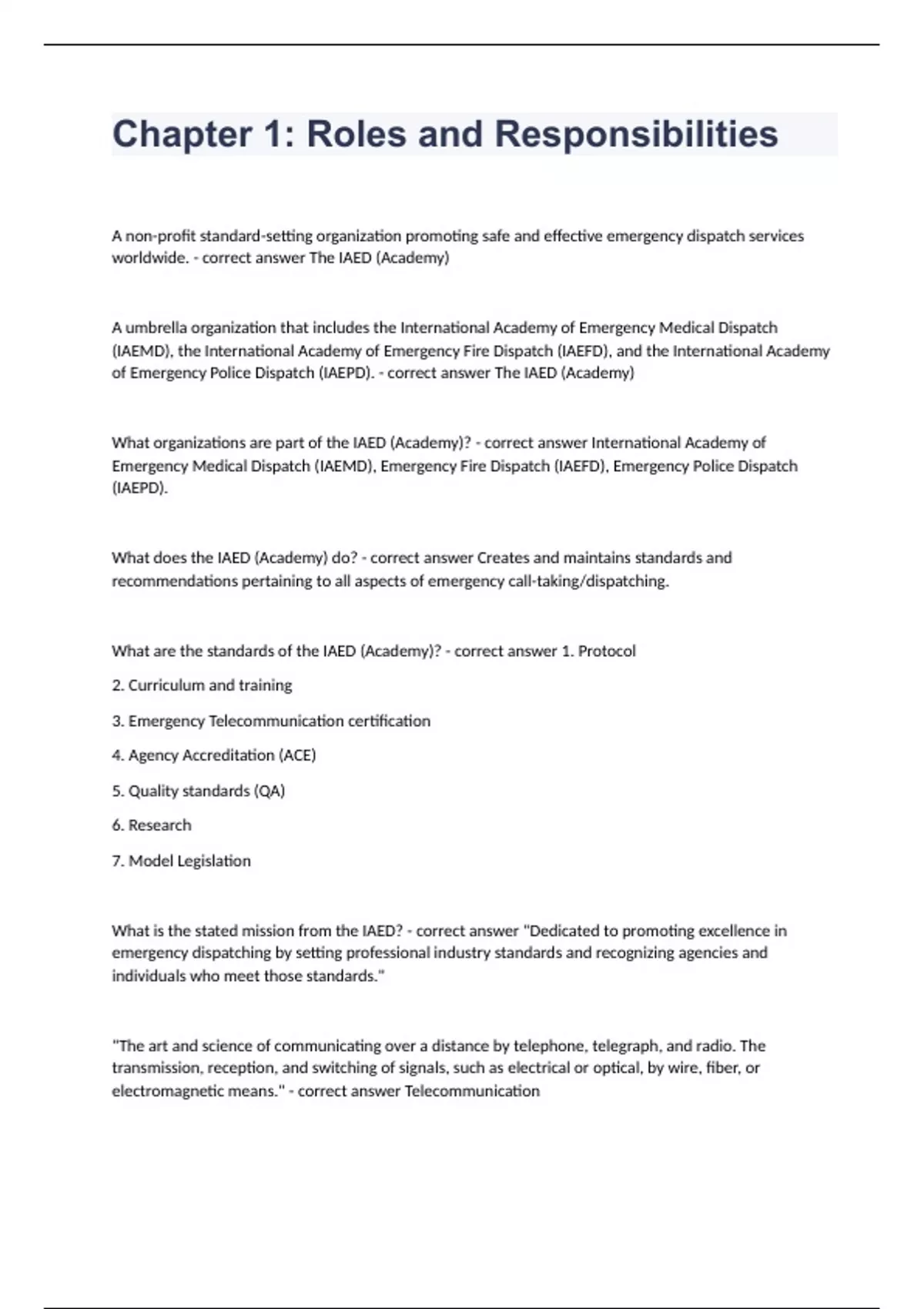 Chapter 1 Roles and Responsibilities Question and answers rated A+ 2023/2024A non-profit standard-setting organization promoting safe and effective emergency dispatch services worldwide. - correct answer The IAED (Academy) A umbrella organization that includes the International Academy of Emergency Medical Dispatch (IAEMD), the International Academy of Emergency Fire Dispatch (IAEFD), and the International Academy of Emergency Police Dispatch (IAEPD). - correct answer The IAED (Academy)