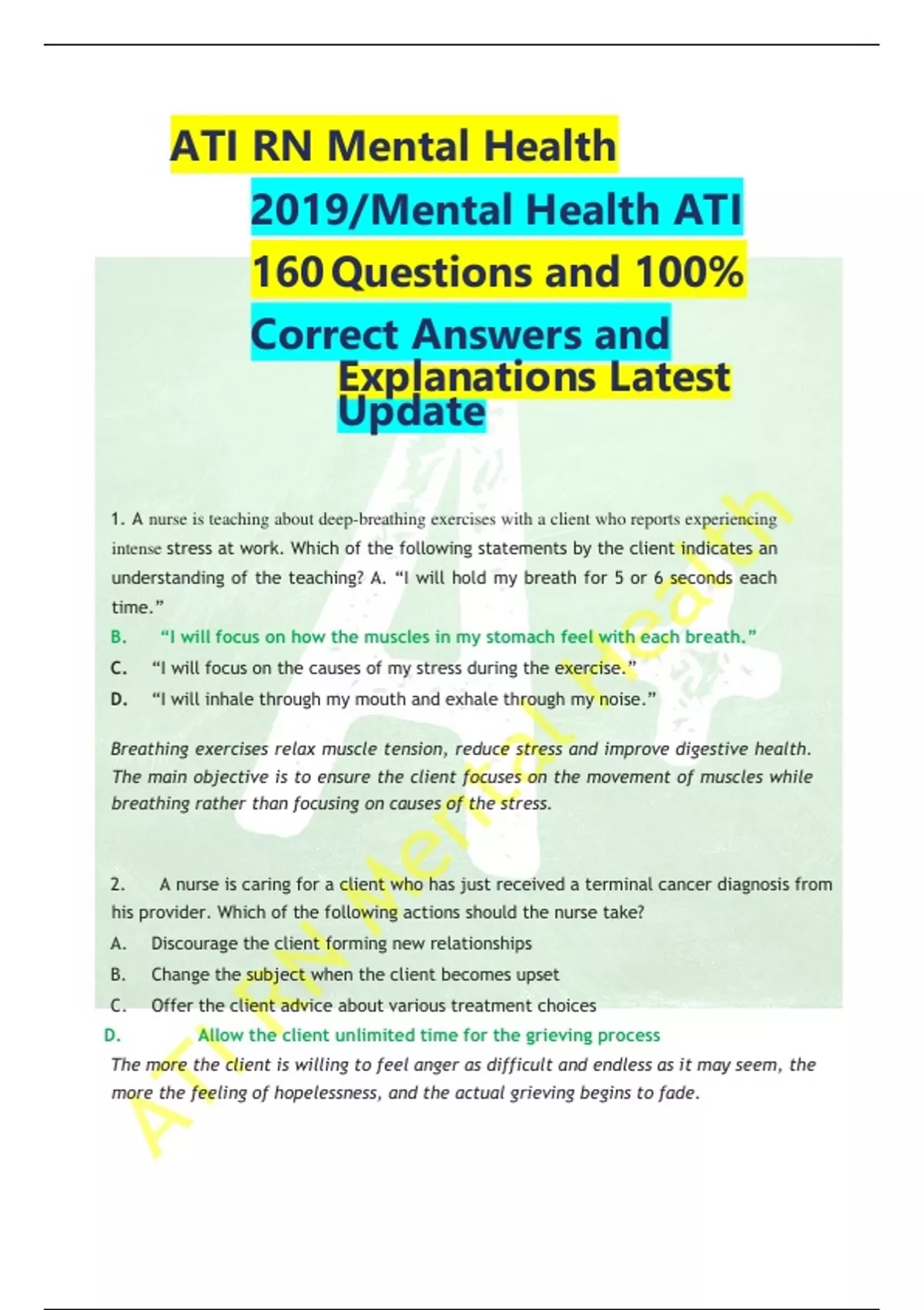 ATI RN Mental Health 2019/Mental Health ATI 160Questions and 100% Correct Answers and Explanations Latest Update 1. A nurse is teaching about deep-breathing exercises with a client who reports experiencing intense stress at work. Which of the following statements by the client indicates an understanding of the teaching? A. “I will hold my breath for 5 or 6 seconds each time.” B. “I will focus on how the muscles in my stomach feel with each breath.” C. “I will focus on the causes of my stress during the exercise.” D. “I will inhale through my mouth and exhale through my noise.” Breathing exercises relax muscle tension, reduce stress and improve digestive health. The main objective is to ensure the client focuses on the movement of muscles while breathing rather than focusing on causes of the stress.