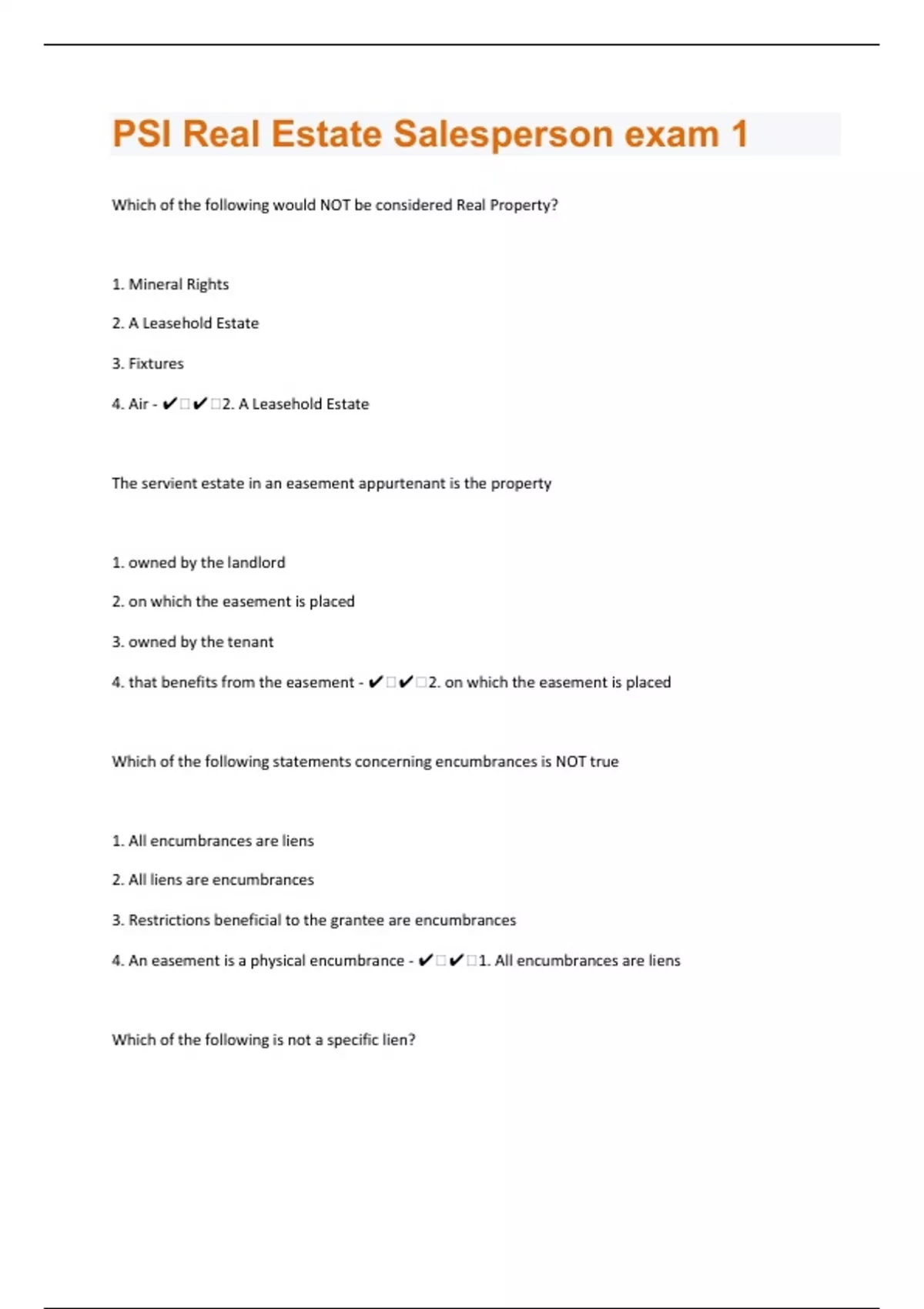 Which of the following would NOT be considered Real Property? 1. Mineral Rights 2. A Leasehold Estate 3. Fixtures 4. Air - ️️2. A Leasehold Estate The servient estate in an easement appurtenant is the property 1. owned by the landlord 2. on which the easement is placed 3. owned by the tenant 4. that benefits from the easement - ️️2. on which the easement is placed Which of the following statements concerning encumbrances is NOT true 1. All encumbrances are liens 2. All liens are encumbrances 3. Restrictions beneficial to the grantee are encumbrances 4. An easement is a physical encumbrance - ️️1. All encumbrances are liens Which of the following is not a specific lien?