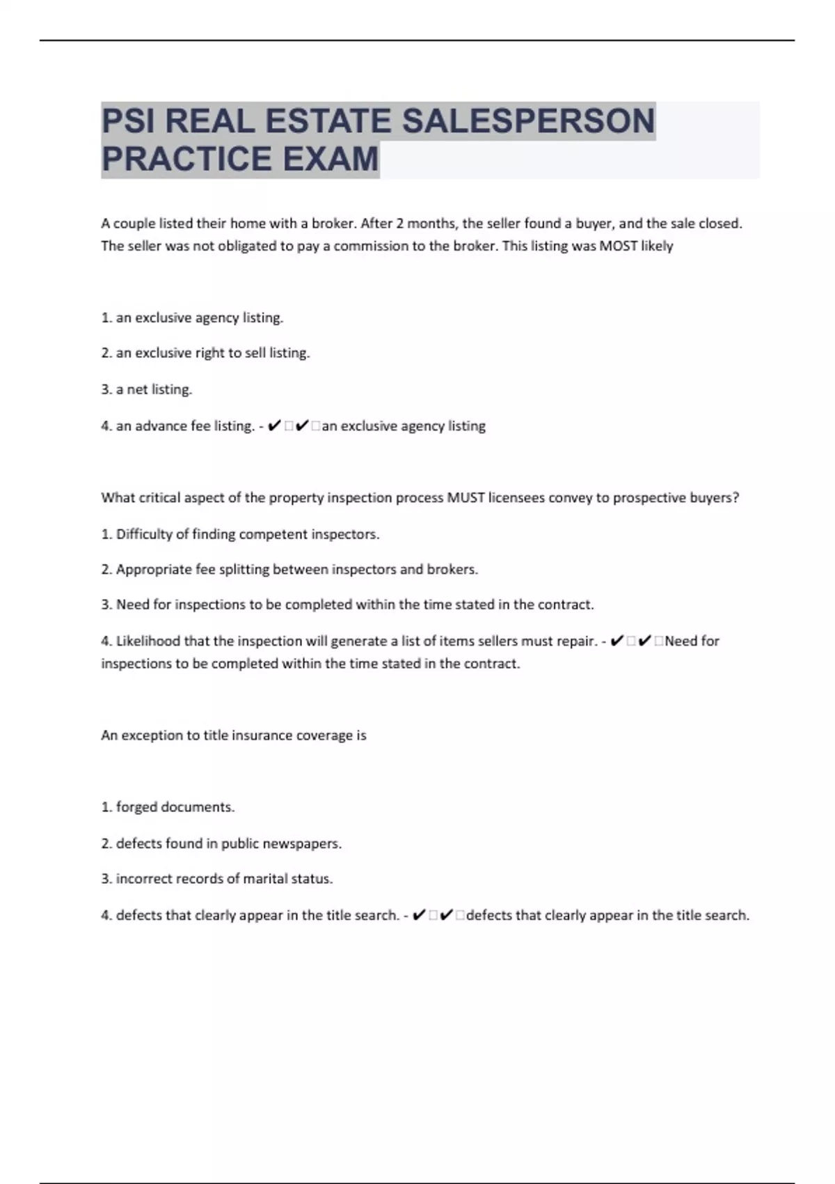 A couple listed their home with a broker. After 2 months, the seller found a buyer, and the sale closed. The seller was not obligated to pay a commission to the broker. This listing was MOST likely 1. an exclusive agency listing. 2. an exclusive right to sell listing. 3. a net listing. 4. an advance fee listing. - ️️an exclusive agency listing What critical aspect of the property inspection process MUST licensees convey to prospective buyers? 1. Difficulty of finding competent inspectors. 2. Appropriate fee splitting between inspectors and brokers. 3. Need for inspections to be completed within the time stated in the contract. 4. Likelihood that the inspection will generate a list of items sellers must repair. - ️️Need for inspections to be completed within the time stated in the contract. An exception to title insurance coverage is 1. forged documents. 2. defects found in public newspapers. 3. incorrect records of marital status. 4. defects that clearly appear in the title search. - ️️defects that clearly appear in the title search.