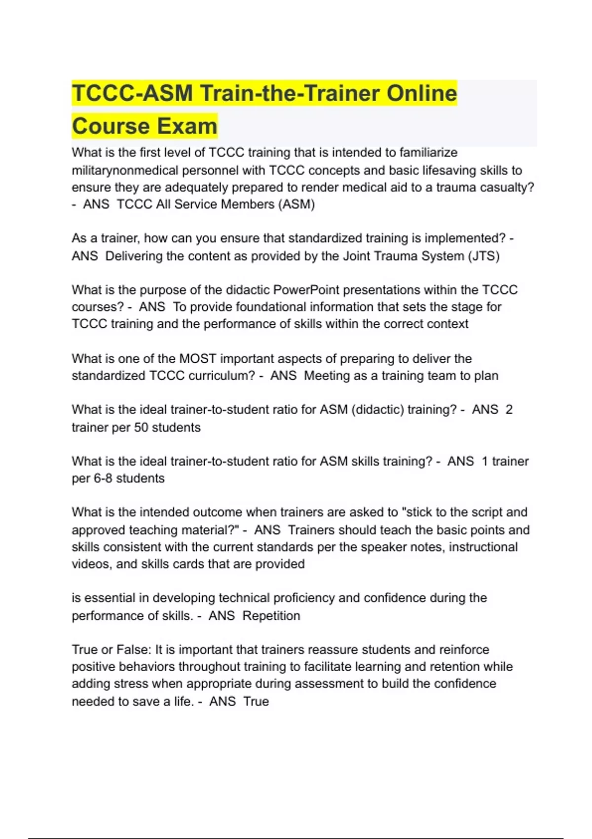 TCCC-ASM Train-the-Trainer Online Course Exam QUESTIONS & ANSWERS 2024 ( A+ GRADED 100% VERIFIED)
