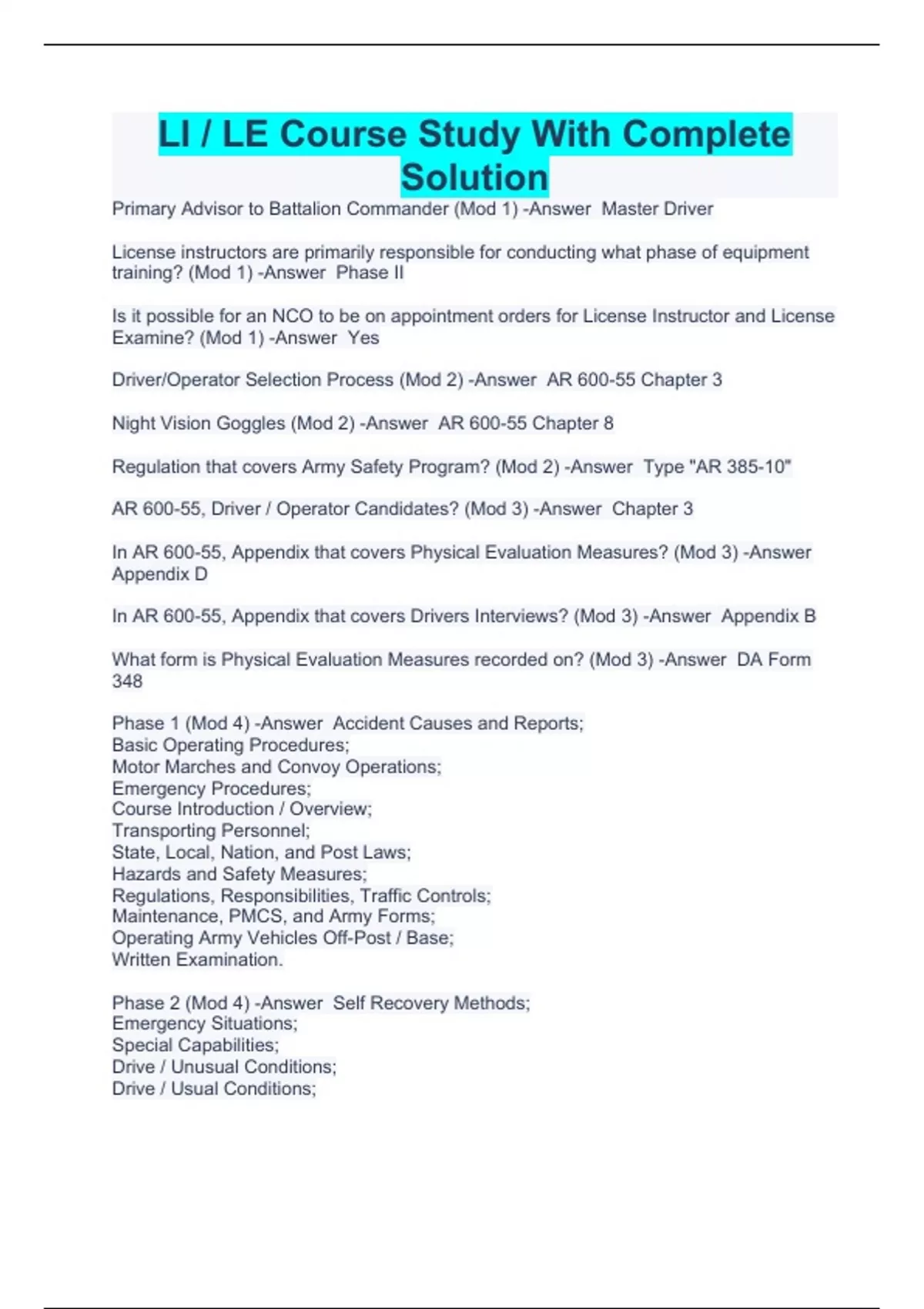 Primary Advisor to Battalion Commander (Mod 1) -Answer Master Driver License instructors are primarily responsible for conducting what phase of equipment training? (Mod 1) -Answer Phase II Is it possible for an NCO to be on appointment orders for License Instructor and License Examine? (Mod 1) -Answer Yes Driver/Operator Selection Process (Mod 2) -Answer AR 600-55 Chapter 3 Night Vision Goggles (Mod 2) -Answer AR 600-55 Chapter 8 Regulation that covers Army Safety Program? (Mod 2) -Answer Type "AR 385-10" AR 600-55, Driver / Operator Candidates? (Mod 3) -Answer Chapter 3 In AR 600-55, Appendix that covers Physical Evaluation Measures? (Mod 3) -Answer Appendix D In AR 600-55, Appendix that covers Drivers Interviews? (Mod 3) -Answer Appendix B What form is Physical Evaluation Measures recorded on? (Mod 3) -Answer DA Form 348 Phase 1 (Mod 4) -Answer Accident Causes and Reports; Basic Operating Procedures; Motor Marches and Convoy Operations; Emergency Procedures; Course Introduction / Overview; Transporting Personnel; State, Local, Nation, and Post Laws; Hazards and Safety Measures; Regulations, Responsibilities, Traffic Controls; Maintenance, PMCS, and Army Forms; Operating Army Vehicles Off-Post / Base; Written Examination. Phase 2 (Mod 4) -Answer Self Recovery Methods; Emergency Situations; Special Capabilities; Drive / Unusual Conditions; Drive / Usual Conditions;