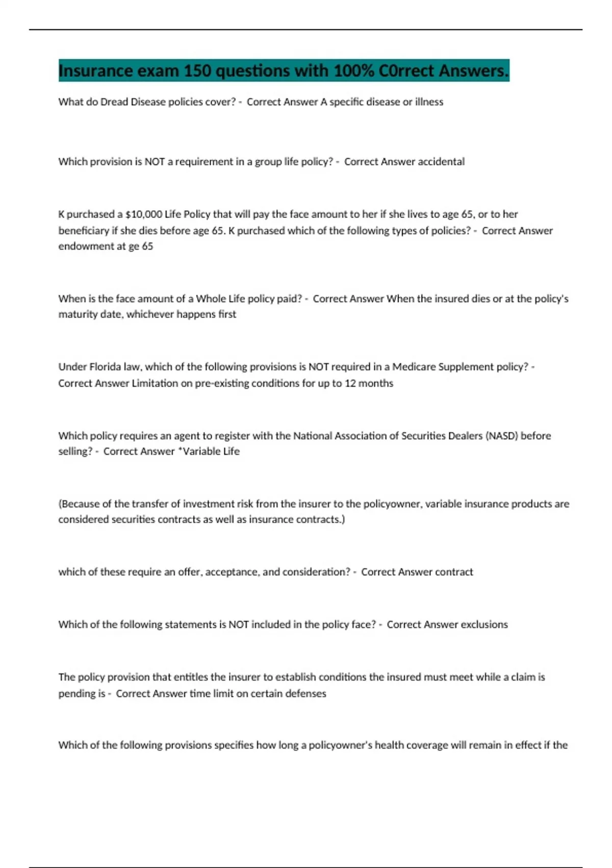 Insurance exam 150 questions with 100% C0rrect Answers.