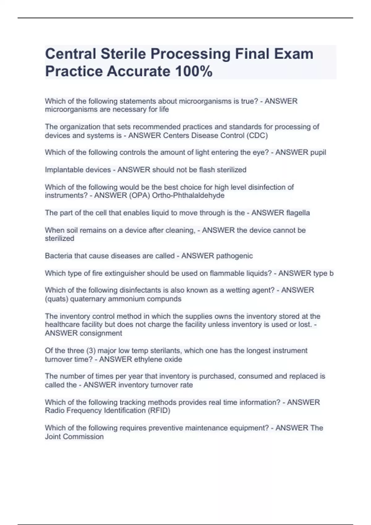 Which of the following statements about microorganisms is true? - ANSWER microorganisms are necessary for life The organization that sets recommended practices and standards for processing of devices and systems is - ANSWER Centers Disease Control (CDC) Which of the following controls the amount of light entering the eye? - ANSWER pupil Implantable devices - ANSWER should not be flash sterilized Which of the following would be the best choice for high level disinfection of instruments? - ANSWER (OPA) Ortho-Phthalaldehyde The part of the cell that enables liquid to move through is the - ANSWER flagella When soil remains on a device after cleaning, - ANSWER the device cannot be sterilized Bacteria that cause diseases are called - ANSWER pathogenic Which type of fire extinguisher should be used on flammable liquids? - ANSWER type b Which of the following disinfectants is also known as a wetting agent? - ANSWER (quats) quaternary ammonium compunds The inventory control method in which the supplies owns the inventory stored at the healthcare facility but does not charge the facility unless inventory is used or lost. - ANSWER consignment Of the three (3) major low temp sterilants, which one has the longest instrument turnover time? - ANSWER ethylene oxide The number of times per year that inventory is purchased, consumed and replaced is called the - ANSWER inventory turnover rate Which of the following tracking methods provides real time information? - ANSWER Radio Frequency Identification (RFID) Which of the following requires preventive maintenance equipment? - ANSWER The Joint Commission How frequently should a sterilizer drain strainer be removed and thoro