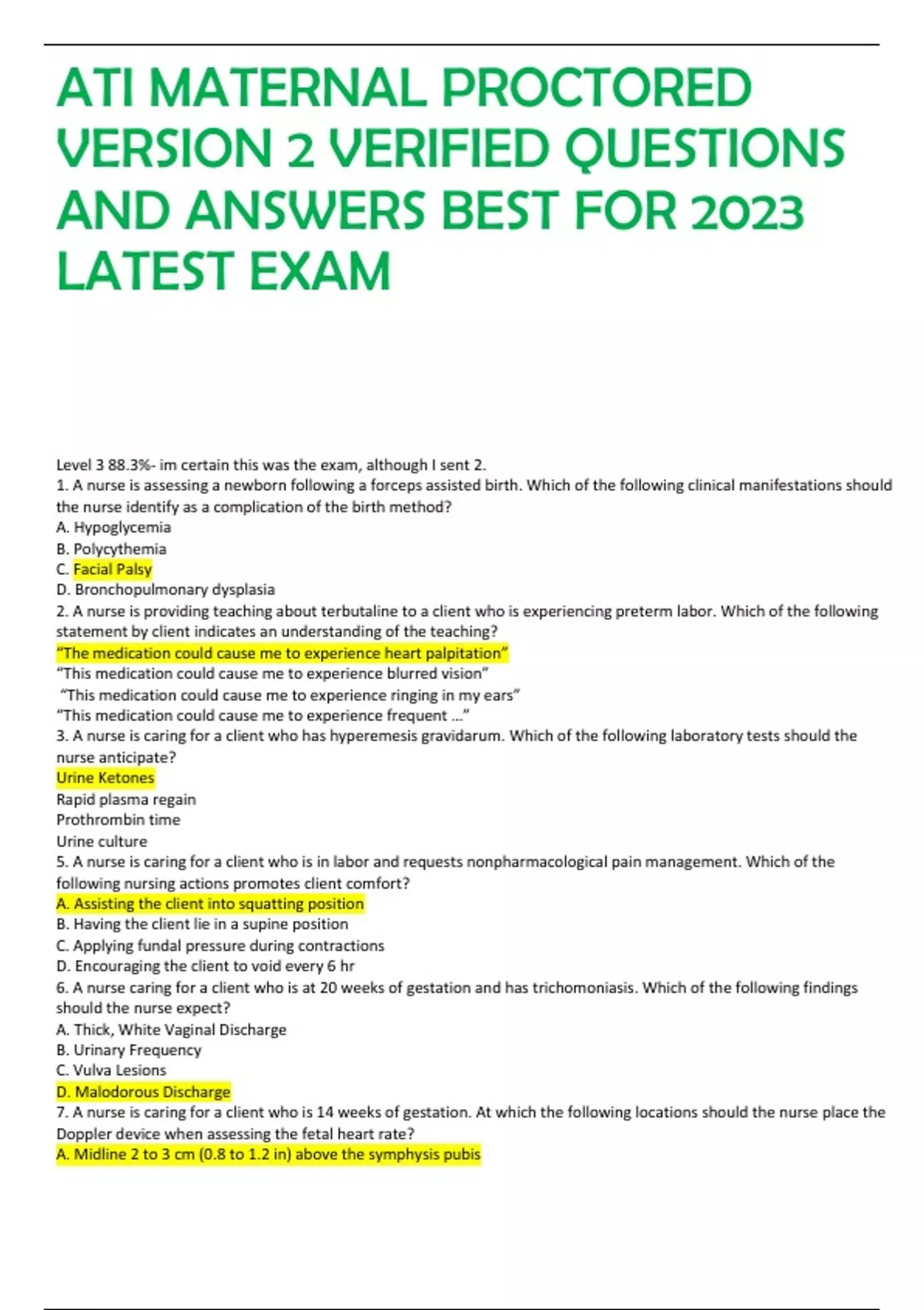 ATI MATERNAL PROCTORED VERSION 2 VERIFIED QUESTIONS AND ANSWERS BEST FOR 2023 LATEST EXAM Level 3 88.3%- im certain this was the exam, although I sent 2. 1. A nurse is assessing a newborn following a forceps assisted birth. Which of the following clinical manifestations should the nurse identify as a complication of the birth method? A. Hypoglycemia B. Polycythemia C. Facial Palsy D. Bronchopulmonary dysplasia 2. A nurse is providing teaching about terbutaline to a client who is experiencing preterm labor. Which of the following statement by client indicates an understanding of the teaching? “The medication could cause me to experience heart palpitation” “This medication could cause me to experience blurred vision” “This medication could cause me to experience ringing in my ears” “This medication could cause me to experience frequent …” 3. A nurse is caring for a client who has hyperemesis gravidarum. Which of the following laboratory tests should the nurse anticipate? Urine Ketones Rapid plasma regain Prothrombin time Urine culture 5. A nurse is caring for a client who is in labor and requests nonpharmacological pain management. Which of the following nursing actions promotes client comfort? A. Assisting the client into squatting position B. Having the client lie in a supine position C. Applying fundal pressure during contractions D. Encouraging the client to void every 6 hr 6. A nurse caring for a client who is at 20 weeks of gestation and has trichomoniasis. Which of the following findings should the nurse expect? A. Thick, White Vaginal Discharge B. Urinary Frequency C. Vulva Lesions D. Malodorous Discharge 7. A nurse is caring for a client who is 14 weeks of gestation. At which the following locations should the nurse place the Doppler device when assessing the fetal heart rate? A. Midline 2 to 3 cm (0.8 to 1.2 in) above the symphysis pubis B. Left Upper Abdomen C. Two fingerbreadths above the umbilicus D. Lateral at the Xiphoid Process 8.A nurse is assessing a client who is at 27 weeks of gestation and has preeclampsia. Which of the following findings should the nurse report to the provider? A. Urine protein concentration 200 mg/ 24 hr B. Creatinine 0.8 mg/ dL C. Hemoglobin 14.8 g/ dL D. Platelet Count 60.000/ mm3 9. A nurse is teaching about clomiphene citrate to a client who is experiencing infertility. Which of the following adverse effect should the nurse include? A. Tinnitus B. Urinary Frequency C. Breast Tenderness D. Chills 10. A nurse is assessing a newborn upon admission to the nursery. Which of the following should the nurse expect? A. Bulging Fontanels B. Nasal Flaring C. Length from head to heel of 40 cm (15.7 in) D. Chest circumference 2 cm (0.8 in) smaller than the head circumference 11. A nurse is planning care for a newborn who has neonatal abstinence syndrome. Which of the following interventions should the nurse include in the plan of care? A. Increase the newborn’s visual stimulation B. Weigh the newborn every other day C. Discourage parental interaction until after a social evaluation D. Swaddle the newborn in a flexed position 12. A nurse is caring for a newborn who is 6 hr old and has a bedside glucometer reading of 65 mg/ dL. The newborn’s mother has type 2 diabetes mellitus. Which of the following actions should the nurse take? A. Obtain a blood sample for a serum glucose level B. Feed the newborn immediately C. Administer 50 mL of dextrose solution IV D. Reassess the blood glucose level prior to the next feeding 13. A nurse is providing teaching to a client about exercise safety during pregnancy. Which of the following statements by the client indicates an understanding of the teaching? (Select all that apply). A. “I will limit my time in the hot tub to 30 minutes after exercise.” B. “I should consume three 8-ounce glasses of water after I exercise.” C. “I will check my heart rate every 15 minutes during exercise sessions.” D. “I should limit exercise sessions to 30 minutes when the weather is humid.” E. “I should rest by lying on my side for 10 minutes following exercise.” 14. A charge nurse is teaching a group of staff nurses about fetal monitoring during labor. Which of the following findings should the charge nurse instruct the staff members to report to the provider? A. Contraction durations of 95 to 100 seconds B. Contraction frequency of 2 to 3 min apart C. Absent early deceleration of fetal heart rate D. Fetal heart rate is 140/min 15. A nurse in a woman’s health clinic is obtaining a health history from a client. Which of the following findings should the nurse identify as increasing the client’s risk for developing pelvic inflammatory disease (PID)? A. Recurrent Cystitis B. Frequent Alcohol Use C. Use of Oral Contraceptives D. Chlamydia Infection 16. A nurse is teaching a prenatal class about immunizations that newborns receive following birth. Which of the following immunizations should the nurse include in the teaching? A. Hepatitis B B. Rotavirus C. Pneumococcal D. Varicella 17. A nurse is providing nutritional guidance to a client who is pregnant and follows a vegan diet. The client asks the nurse which foods she should eat to ensure adequate calcium intake. The nurse should instruct the client that which of the following foods has the highest amount of calcium? A. ½ cup cubed avocado B. 1 large banana C. 1 medium potato D. 1 cup cooked broccoli 18. A nurse in a provider’s office is assessing a client at her first antepartum visit. The client states that the first day of her last menstrual period was March 8. Use Negele’s rule to calculate the estimated date of delivery. (Use the MMDD format with four numerals and no spaces or punctuation.) December 15 19. A nurse is caring for a client who is in the second stage of labor. Which of the following manifestations should the nurse expect? A. The client expels the placenta B. The client experiences gradual dilation of the cervix C. The client begin