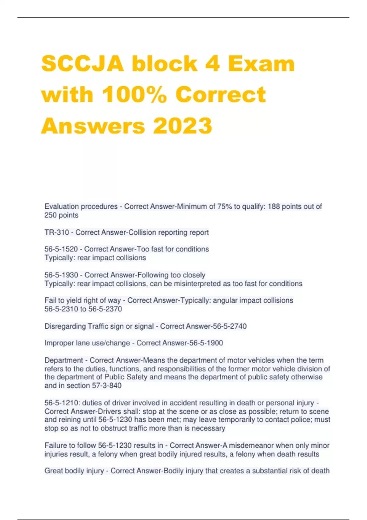 SCCJA block 4 Exam with 100% Correct Answers 2023 Evaluation procedures - Correct Answer-Minimum of 75% to qualify: 188 points out of 250 points TR-310 - Correct Answer-Collision reporting report 56-5-1520 - Correct Answer-Too fast for conditions Typically: rear impact collisions 56-5-1930 - Correct Answer-Following too closely Typically: rear impact collisions, can be misinterpreted as too fast for conditions Fail to yield right of way - Correct Answer-Typically: angular impact collisions 56-5-2310 to 56-5-2370 Disregarding Traffic sign or signal - Correct Answer-56-5-2740 Improper lane use/change - Correct Answer-56-5-1900 Department - Correct Answer-Means the department of motor vehicles when the term refers to the duties, functions, and responsibilities of the former motor vehicle division of the department of Public Safety and means the department of public safety otherwise and in section 57-3-840 56-5-1210: duties of driver involved in accident resulting in death or personal injury - Correct Answer-Drivers shall: stop at the scene or as close as possible; return to scene and reining until 56-5-1230 has been met; may leave temporarily to contact police; must stop so as not to obstruct traffic more than is necessary Failure to follow 56-5-1230 results in - Correct Answer-A misdemeanor when only minor injuries result, a felony when great bodily injured results, a felony when death results Great bodily injury - Correct Answer-Bodily injury that creates a substantial risk of death or which causes serious, permanent, disfigurement, or protracted loss or impairment of the function of a bodily member or organ Identify the three elements that must be present for deadly force to be employed. - Correct Answer-a. Ability b. Opportunity c. Jeopardy Sight alignment - Correct Answer-How you look through sights so front sight is aligned with rear sight When can deadly force be used? - Correct Answer-Self defense. b. In defense of another person. c. To prevent the commission of dangerous felony: murder, kidnapping, etc. d. To halt a fleeing felon who is an immediate significant threat of death or serious physical injury to others. Tennessee vs. Garner - Correct Answer-"Fleeing Felon Doctrine" Graham vs. Connor - Correct Answer-set forth a standard for police use of force, Out of that decision, two words that have become important in any use of force issue are reasonable and necessary Reasonable - Correct Answer-That which is reasonable is using or showing reasons or sound judgment and not extreme or excessive force. Necessary - Correct Answer-That which is necessary is that which must be done, is mandatory, or is compelled by circumstances. Ability - Correct Answer-Ability is having enough power or skill to do something Opportunity - Correct Answer-Opportunity is a combination of circumstances favorable for the purpose of time or a good chance or occasion to use one's ability. Probable cause must still exist Jeopardy - Correct Answer-Jeopardy is great danger, peril, or to have one's life in danger. Section 56-5-1220. - Correct Answer-Duties of driver involved in accident resulting in damage to attended vehicles. Where there are No injuries, and vehicle involved is obstructing traffic: - Correct Answer-Driver must Make every effort to safely move the vehicle to restore traffic flow Reporting of accidents occurring on private property - Correct Answer-A motorist is required to submit a written report to the South Carolina department of public safety of an accident that occurs on private property Investigation of accidents occurring on private property - Correct Answer-There is nothing to prevent law enforcement officer from entering private property in order to investigate the probability of a violation of law, especially when the area to be entered is an open area, such as a road or parking lot to which the public is invited Te-310 directions - Correct Answer-Standard direction Odd number on roadway or highway (us 321) - Correct Answer-Listed as North/south Even number on roadway or highway (us 176) - Correct Answer-Listed as east/west If the map direction of an even number route is actually north or south, - Correct Answer-Is must be converted If the map direction of an odd number route is actually east or west, - Correct Answer-It must be converted Conversions for direction - Correct Answer-North=east, south=west, east=north, west=south Base intersection - Correct Answer-Always the closest public roadway that interests the roadway that the collision occurred on Second intersection - Correct Answer-Located by measuring from the center of the base intersection to the collision location, then continuing in the same direction to the next intersection of a public roadway If the roadway has more than one highway number - Correct Answer-We report the collision as located on the lowest number highway If the roadway has not only two different route numbers but also different priorities - Correct Answer-We report the highest priority Roadways are prioritized in this order - Correct Answer-1: interstate, 2: US primary, 3: state primary, 4: secondary, 5: city or county roads, 6: others If block is 0 - Correct Answer-This supplemental is not required If there are 1 or more blocks with any number 1 or greater - Correct Answer-Then go to the persons involved section for additional qualifiers Persons involved report - Correct Answer-If no injuries and no vehicles towed, this report is not required Traffic collision data location - Correct Answer-Date, time of collision, time notified, time arrived, location, Number 1 responsibility - Correct Answer-Keep the collision from getting any worse How does an officer report to a traffic collision - Correct Answer-Don't assume other vehicles will yield to emergency personnel Accident - Correct Answer-The occurrence in a sequence (series) of events which usually produces unintended injury, death or property damage Motor vehicle Collision - Correct Answer-Any event that res