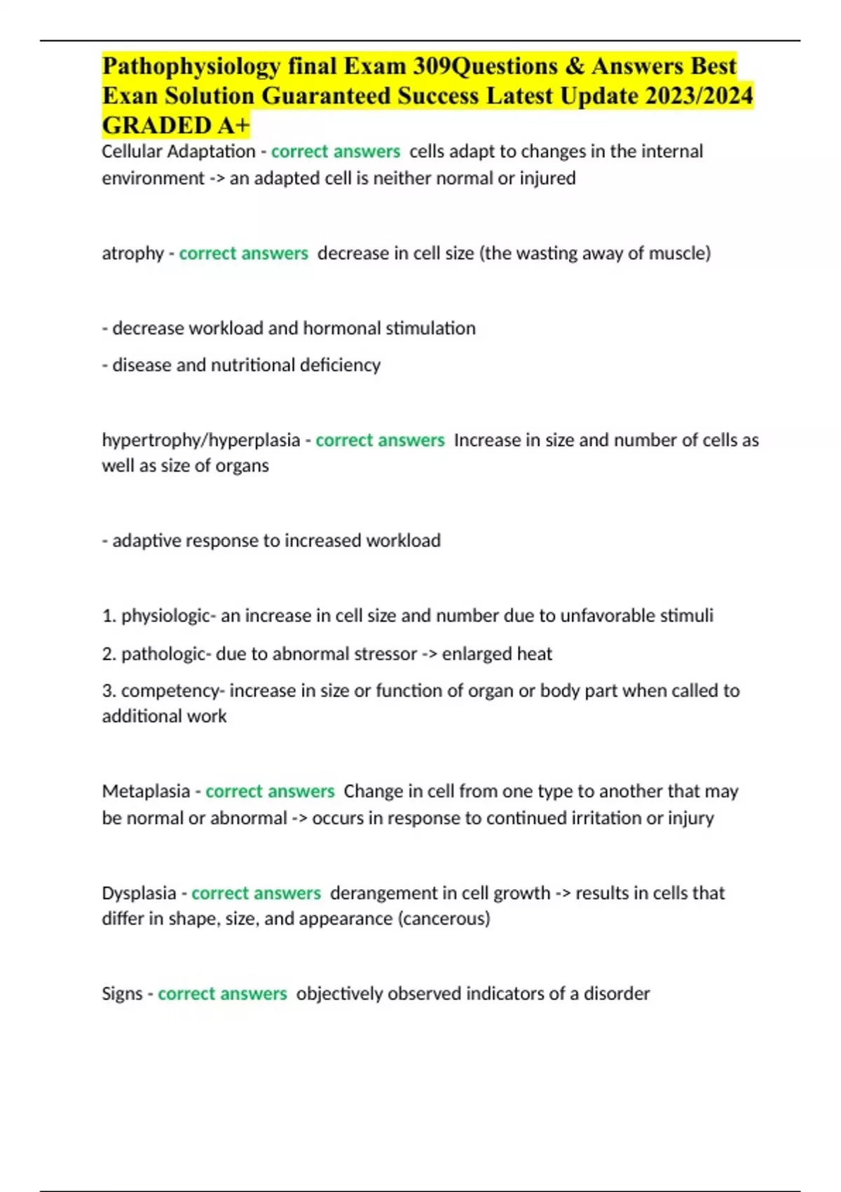Summary Pathophysiology final Exam 309Questions & Answers Best Exan Solution Guaranteed Success Latest Update 2023/2024 GRADED A+