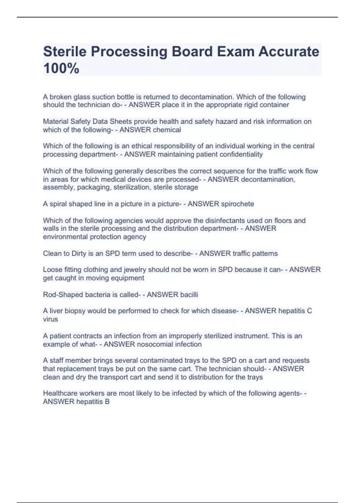 A broken glass suction bottle is returned to decontamination. Which of the following should the technician do- - ANSWER place it in the appropriate rigid container Material Safety Data Sheets provide health and safety hazard and risk information on which of the following- - ANSWER chemical Which of the following is an ethical responsibility of an individual working in the central processing department- - ANSWER maintaining patient confidentiality Which of the following generally describes the correct sequence for the traffic work flow in areas for which medical devices are processed- - ANSWER decontamination, assembly, packaging, sterilization, sterile storage A spiral shaped line in a picture in a picture- - ANSWER spirochete Which of the following agencies would approve the disinfectants used on floors and walls in the sterile processing and the distribution department- - ANSWER environmental protection agency Clean to Dirty is an SPD term used to describe- - ANSWER traffic patterns Loose fitting clothing and jewelry should not be worn in SPD because it can- - ANSWER get caught in moving equipment Rod-Shaped bacteria is called- - ANSWER bacilli A liver biopsy would be performed to check for which disease- -