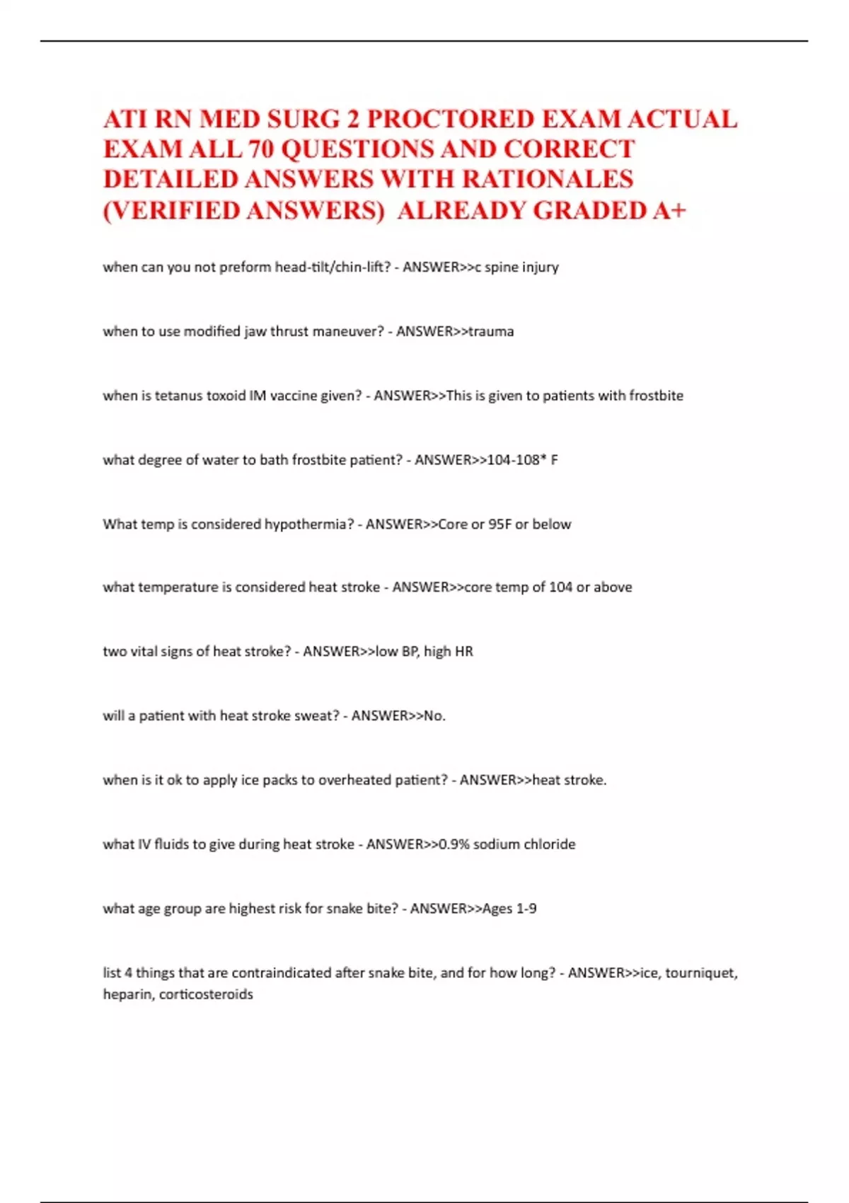 ATI RN MED SURG 2 PROCTORED EXAM ACTUAL EXAM ALL 70 QUESTIONS AND CORRECT DETAILED ANSWERS WITH RATIONALES (VERIFIED ANSWERS) ALREADY GRADED A+ when can you not preform head-tilt/chin-lift? - ANSWERc spine injury when to use modified jaw thrust