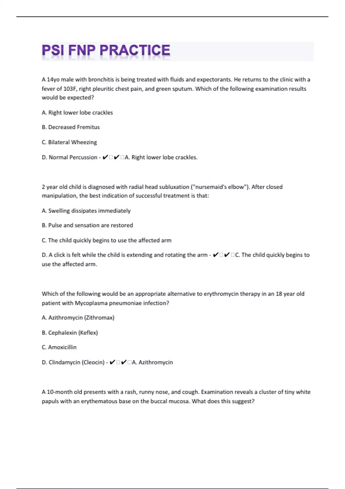 A 14yo male with bronchitis is being treated with fluids and expectorants. He returns to the clinic with a fever of 103F, right pleuritic chest pain, and green sputum. Which of the following examination results would be expected? A. Right lower lobe crackles B. Decreased Fremitus C. Bilateral Wheezing D. Normal Percussion - ️️A. Right lower lobe crackles. 2 year old child is diagnosed with radial head subluxation ("nursemaid's elbow"). After closed manipulation, the best indication of successful treatment is that: A. Swelling dissipates immediately B. Pulse and sensation are restored C. The child quickly begins to use the affected arm D. A click is felt while the child is extending and rotating the arm - ️️C. The child quickly begins to use the affected arm. Which of the following would be an appropriate alternative to erythromycin therapy in an 18 year old patient with Mycoplasma pneumoniae infection? A. Azithromycin (Zithromax) B. Cephalexin (Keflex) C. Amoxicillin D. Clindamycin (Cleocin) - ️️A. Azithromycin A 10-month old presents with a rash, runny nose, and cough. Examination reveals a cluster of tiny white papuls with an erythematous base on the buccal mucosa. What does this suggest?