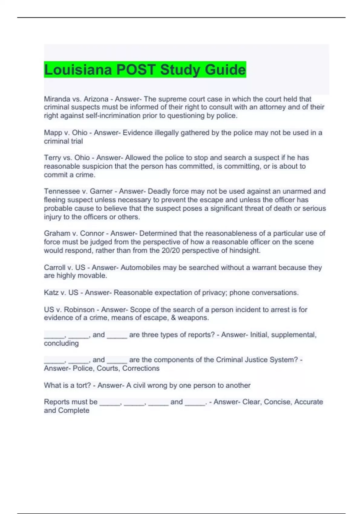 Louisiana POST Study Guide with complete solutions