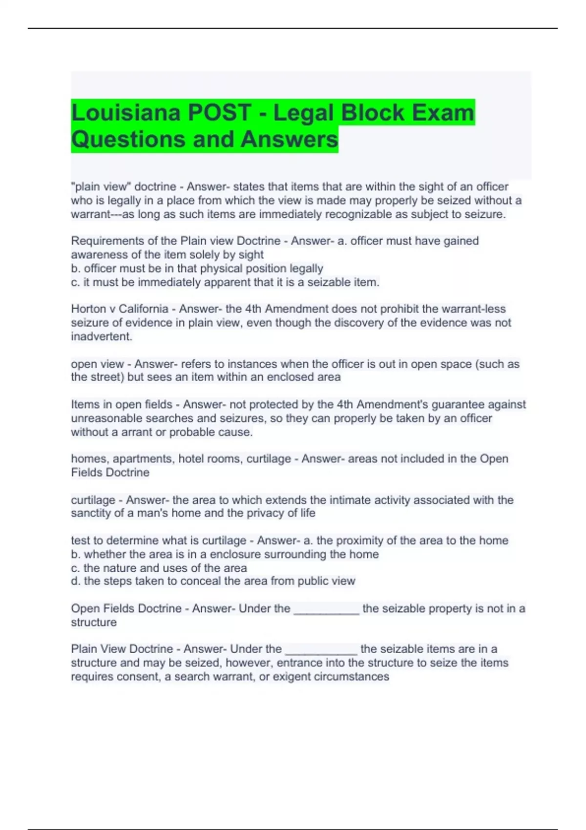 Louisiana POST - Legal Block Exam Questions and Answers