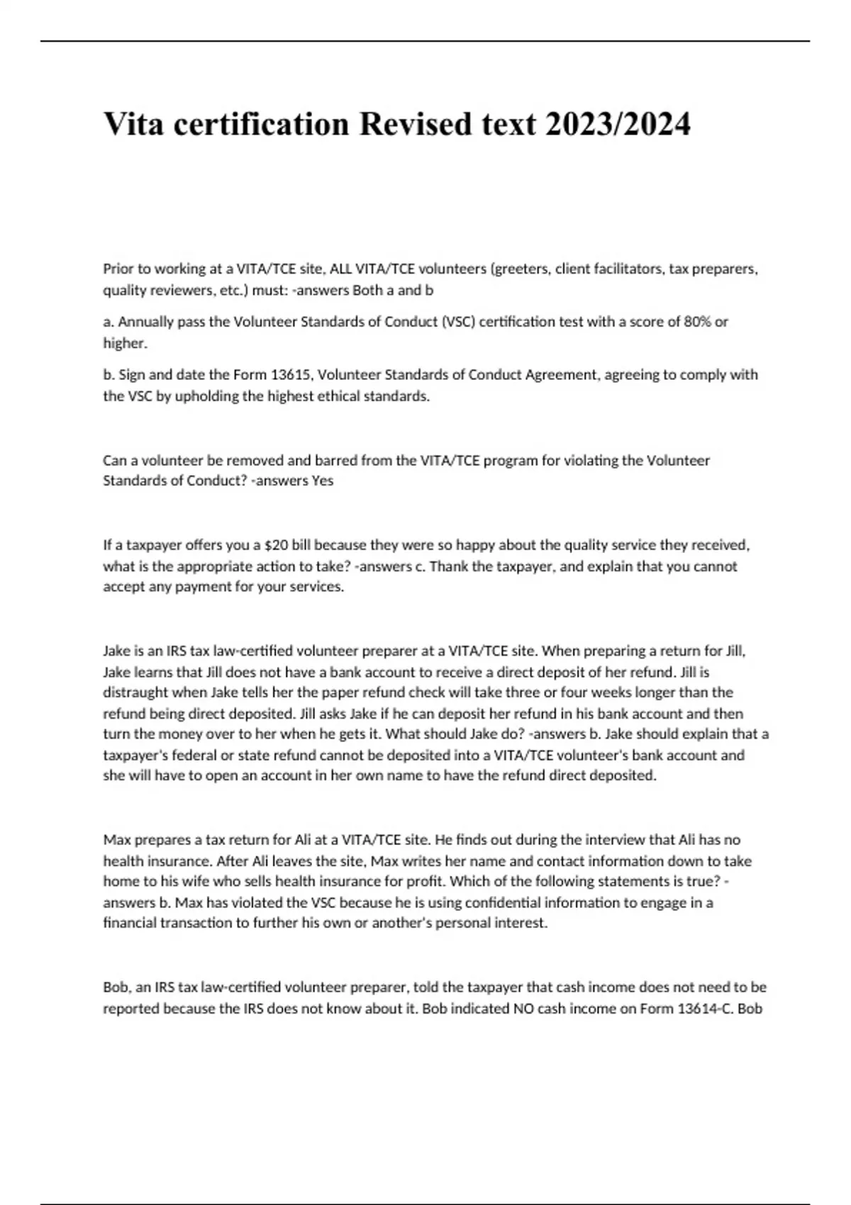 VSC by upholding the highest ethical standards. Can a volunteer be removed and barred from the VITA/TCE program for violating the Volunteer Standards of Conduct? -answers Yes If a taxpayer offers you a $20 bill because they were so happy about the quality service they received, what is the appropriate action to take? -answers c. Thank the taxpayer, and explain that you cannot accept any payment for your services. Jake is an IRS tax law-certified volunteer preparer at a VITA/TCE site. When preparing a return for Jill, Jake learns that Jill does not have a bank account to receive a direct deposit of her refund. Jill is distraught when Jake tells her the paper refund check will take three or four weeks longer than the refund being direct deposited. Jill asks Jake if he can deposit her refund in his bank account and then turn the money over to her when he gets it. What should Jake do? -answers b. Jake should explain that a taxpayer's federal or state refund cannot be deposited into a VITA/TCE volunteer's bank account and she will have to open an account in her own name to have the refund direct deposited.