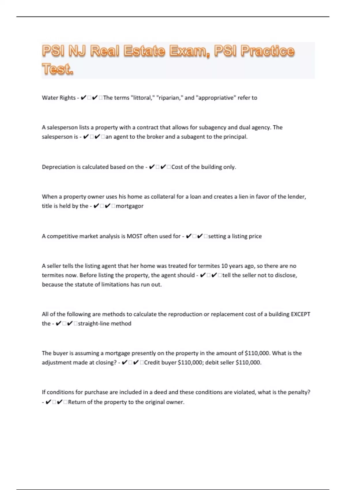 Water Rights - ️️The terms "littoral," "riparian," and "appropriative" refer to A salesperson lists a property with a contract that allows for subagency and dual agency. The salesperson is - ️️an agent to the broker and a subagent to the principal. Depreciation is calculated based on the - ️️Cost of the building only. When a property owner uses his home as collateral for a loan and creates a lien in favor of the lender, title is held by the - ️️mortgagor A competitive market analysis is MOST often used for - ️️setting a listing price A seller tells the listing agent that her home was treated for termites 10 years ago, so there are no termites now. Before listing the property, the agent should - ️️tell the seller not to disclose, because the statute of limitations has run out. All of the following are methods to calculate the reproduction or replacement cost of a building EXCEPT the - ️️straight-line method The buyer is assuming a mortgage presently on the property in the amount of $110,000. What is the adjustment made at closing? - ️️Credit buyer $110,000; debit seller $110,000. If conditions for purchase are included in a deed and these conditions are violated, what is the penalty? - ️️Return of the property to the original owner.