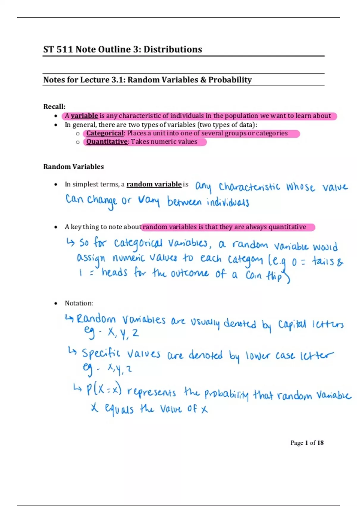 Lecture notes of 18 pages for the course ST 311 at North Carolina State University (notes)