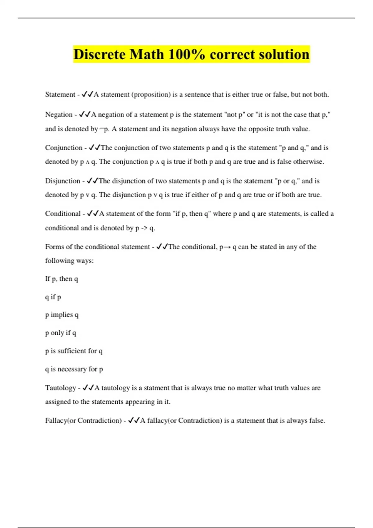 Statement - A statement (proposition) is a sentence that is either true or false, but not both. Negation - A negation of a statement p is the statement "not p" or "it is not the case that p," and is denoted by ⌐p. A statement and its negation always have the opposite truth value. Conjunction - The conjunction of two statements p and q is the statement "p and q," and is denoted by p ᴧ q. The conjunction p ᴧ q is true if both p and q are true and is false otherwise. Disjunction - The disjunction of two statements p and q is the statement "p or q," and is denoted by p v q. The disjunction p v q is true if either of p and q are true or if both are true. Conditional - A statement of the form "if p, then q" where p and q are statements, is called a conditional and is denoted by p -> q. Forms of the conditional statement - The conditional, p→ q can be stated in any of the following ways: If p, then q q if p p implies q p only if q p is sufficient for q q is necessary for p Tautology - A tautology is a statment that is always true no matter what truth values are assigned to the statements appearing in it.