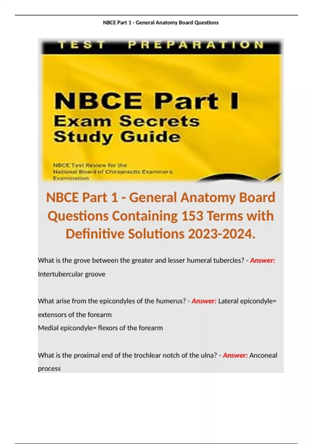NBCE Part 1 - General Anatomy Board Questions Containing 153 Terms with Definitive Solutions .