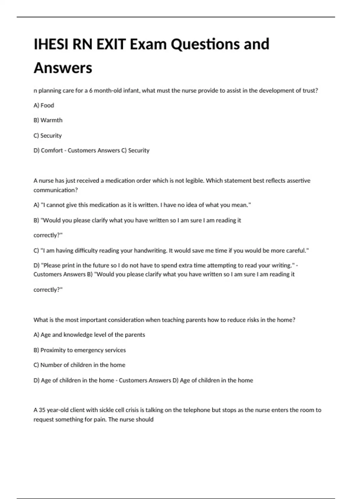 planning care for a 6 month-old infant, what must the nurse provide to assist in the development of trust? A) Food B) Warmth C) Security D) Comfort - Customers Answers C) Security A nurse has just received a medication order which is not legible. Which statement best reflects assertive communication? A) "I cannot give this medication as it is written. I have no idea of what you mean." B) "Would you please clarify what you have written so I am sure I am reading it correctly?" C) "I am having difficulty reading your handwriting. It would save me time if you would be more careful." D) "Please print in the future so I do not have to spend extra time attempting to read your writing." - Customers Answers B) "Would you please clarify what you have written so I am sure I am reading it correctly?" What is the most important consideration when teaching parents how to reduce risks in the home? A) Age and knowledge level of the parents B) Proximity to emergency services C) Number of children in the home D) Age of children in the home - Customers Answers D) Age of children in the home A 35 year-old client with sickle cell crisis is talking on the telephone but stops as the nurse enters the room to request something for pain. The nurse should A) Administer a placebo B) Encourage increased fluid intake C) Administer the prescribed analgesia D) Recommend relaxation exercises for pain control - Customers Answers C) Administer the prescribed analgesia While caring for a toddler with croup, which initial sign of croup requires the nurse's immediate attention? A) Respiratory rate of 42 B) Lethargy for the past hour C) Apical pulse of 54 D) Coughing up copious secretions - Customers Answers A) Respiratory rate of 42 A client is admitted with low T3 and T4 levels and an elevated TSH level. On initial assessment, the nurse would anticipate which of the following assessment findings? A) Lethargy B) Heat intolerance C) Diarrhea D) Skin eruptions - Customers Answers A) Lethargy The emergency room nurse admits a child who experienced a seizure at school. The father comments that this is the first occurrence, and denies any family history of epilepsy. What is the best response by the nurse? A) "Do not worry. Epilepsy can be treated with medications." B) "The seizure may or may not mean your child has epilepsy." C) "Since this was the first convulsion, it may not happen again." D) "Long term treatment will prevent future seizures." - Customers Answers B) "The seizure may or may not mean your child has epilepsy." Alcohol and drug abuse impairs judgment and increases risk taking behavior. What nursing diagnosis best applies? A) Risk for injury B) Risk for knowledge deficit C) Altered thought process D) Disturbance in self-esteem - Customers Answers A) Risk for injury Which these findings would the nurse more closely associate with anemia in a 10 month-old infant? A) Hemoglobin level of 12 g/dI B) Pale mucosa of the eyelids and lips C) Hypoactivity D) A heart rate between 140 to 160 - Customers Answers B) Pale mucosa of the eyelids and lips The nurse is caring for a client in hypertensive crisis in an intensive care unit. The priority assessment in the first hour of care is A) Heart rate B) Pedal pulses C) Lung sounds D) Pupil responses - Customers Answers D) Pupil responses Which of these clients who are all in the terminal stage of cancer is least appropriate to suggest the use of patient controlled analgesia (PCA) with a pump? A) A young adult with a history of Down's syndrome B) A teenager who reads at a 4th grade level C) An elderly client with numerous arthritic nodules on the hands D) A preschooler with intermittent episodes of alertness - Customers Answers D) A preschooler with intermittent episodes of alertness