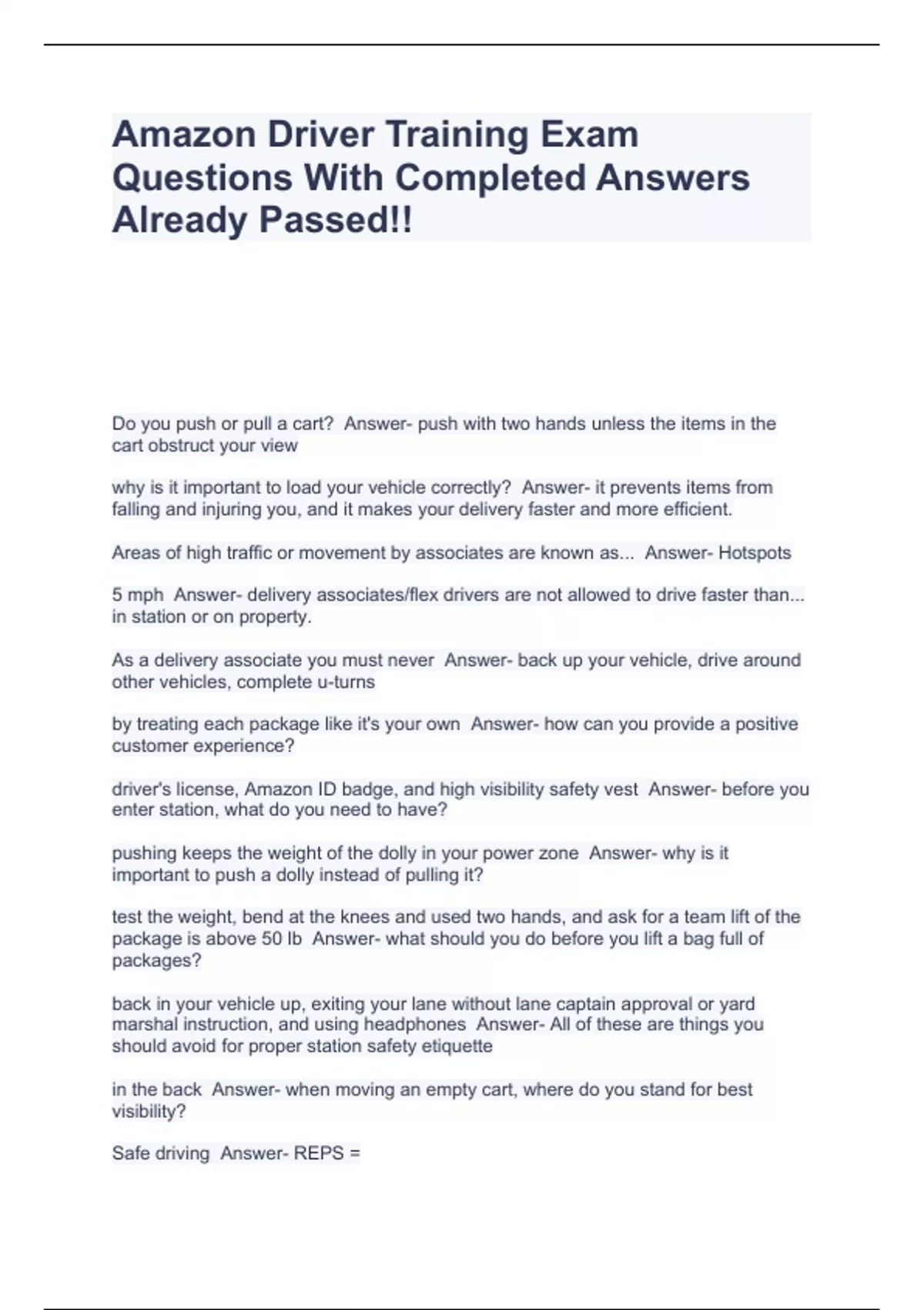 Amazon Driver Training Exam Questions With Completed Answers Already Passed!!