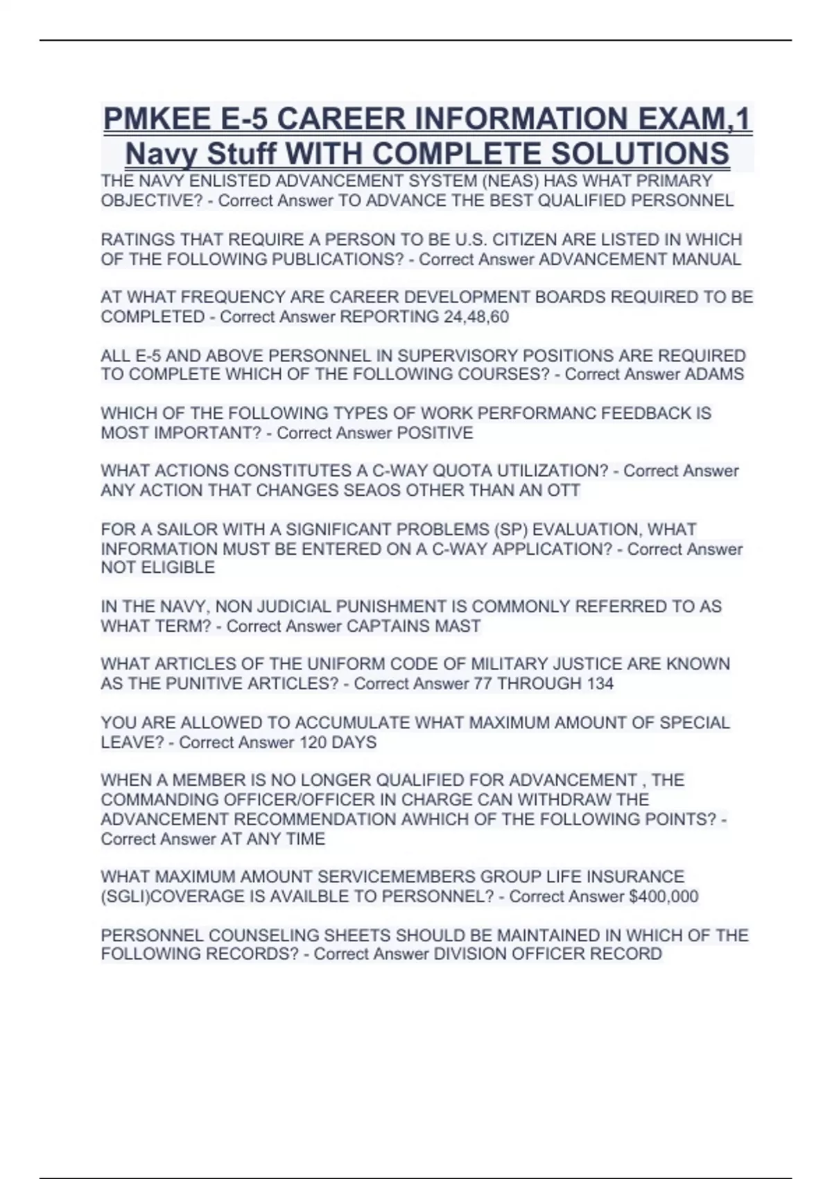 PMKEE E-5 CAREER INFORMATION EXAM,1 Navy Stuff WITH COMPLETE SOLUTIONS
