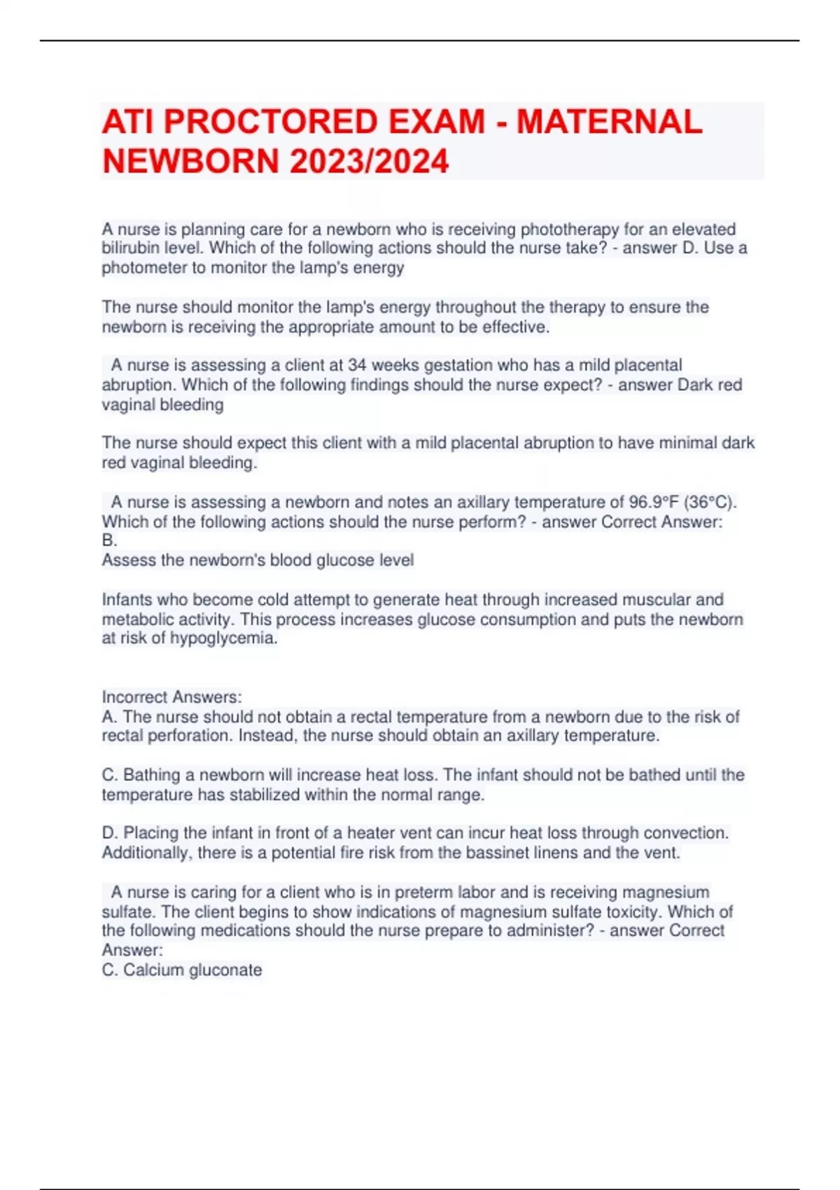 ATI PROCTORED EXAM - MATERNAL NEWBORN 2023/2024 A nurse is planning care for a newborn who is receiving phototherapy for an elevated bilirubin level. Which of the following actions should the nurse take? - answer D. Use a photometer to monitor the lamp's energy The nurse should monitor the lamp's energy throughout the therapy to ensure the newborn is receiving the appropriate amount to be effective. A nurse is assessing a client at 34 weeks gestation who has a mild placental abruption. Which of the following findings should the nurse expect? - answer Dark red vaginal bleeding The nurse should expect this client with a mild placental abruption to have minimal dark red vaginal bleeding. A nurse is assessing a newborn and notes an axillary temperature of 96.9°F (36°C). Which of the following actions should the nurse perform? - answer Correct Answer: B. Assess the newborn's blood glucose level Infants who become cold attempt to generate heat through increased muscular and metabolic activity. This process increases glucose consumption and puts the newborn at risk of hypoglycemia. Incorrect Answers: A. The nurse should not obtain a rectal temperature from a newborn due to the risk of rectal perforation. Instead, the nurse should obtain an axillary temperature. C. Bathing a newborn will increase heat loss. The infant should not be bathed until the temperature has stabilized within the normal range. D. Placing the infant in front of a heater vent can incur heat loss through convection. Additionally, there is a potential fire risk from the bassinet linens and the vent. A nurse is caring for a client who is in preterm labor and is receiving magnesium sulfate. The client begins to show indications of magnesium sulfate toxicity. Which of the following medications should the nurse prepare to administer? - answer Correct Answer: C. Calcium gluconate The nurse should discontinue the magnesium sulfate infusion immediately and prepare to administer calcium gluconate IV to reverse the effects of magnesium sulfate and to prevent cardiac and respiratory arrest. Incorrect Answers: A. Protamine sulfate helps reverse the effects of heparin, not magnesium sulfate. B. Naloxone is an opioid reversal agent. It does not reverse the effects of magnesium sulfate. D. Flumazenil reverses the effects of benzodiazepines such as lorazepam and alprazolam, not magnesium sulfate. A nurse is providing postpartum discharge teaching to a client who is non-lactating about breast discomfort relief measures. Which of the following pieces of information should the nurse include? - answer Correct Answer: "Place fresh cabbage leaves on your breasts." After 3 days postpartum, the client's breasts can become swollen and distended because of congestion of the vascular structures of the breasts. Fresh cabbage leaves can be applied to engorged breasts to help relieve breast discomfort. The coolness of the leaves and the phytoestrogens exert a therapeutic effect on engorged breasts. Leaves should be replaced when they become wilted. Incorrect Answers: A. The client should be instructed to wear a tight-fitting bra or breast binders to alleviate engorgement and swelling. C. Application of warmth to the breasts should be avoided because heat can stimulate milk production. An ice pack should be used to relieve engorged breasts. D. Milk should not be expressed from the breasts. This intervention would increase milk production rather than decrease it. A nurse is educating a client who is at 10 weeks gestation and reports frequent nausea and vomiting. Which of the following statements should the nurse include in the teaching? - answer Correct Answer: D. "You should eat dry foods that are high in carbohydrates when you wake up." The nurse should instruct the client to eat foods that are high in carbohydrates such as dry toast or crackers upon waking or when nausea occurs. Incorrect Answers: A. The nurse should instruct the client to eat foods served at cool temperatures to decrease nausea and vomiting. B. The nurse should instruct the client to avoid brushing her teeth immediately after eating to decrease vomiting. C. The nurse should instruct the client to eat salty and tart foods during periods of nausea. A nurse is providing postpartum discharge teaching for a client who is breastfeeding. The client states, "I've heard that I can't use any birth control until I stop breastfeeding." Which of the following responses should the nurse make? - answer Correct Answer: D. "A progestin-only pill or injection is available for use while you are breastfeeding." Progestin-only injections, implants, and birth control pills are acceptable options for clients who are breastfeeding, although some experts recommend waiting until 6 weeks postpartum to initiate the medication. Incorrect Answers: A. Breastfeeding can inhibit ovulation or prolong menstruation; however, it is not a reliable and effective means of birth control. The client may experience an unplanned pregnancy if she waits until her periods resume before considering birth control options. B. Estrogen-containing birth control pills, implants, patches, and vaginal rings are not recommended for clients who are breastfeeding due to the risk of inhibiting breast milk production and supply. C. Condoms and other non-hormonal birth control methods are appropriate for clients who are breastfeeding; however, there are other methods that are also appropriate. A nurse is assessing a client who is receiving morphine via a patient-controlled analgesia (PCA) pump following a cesarean birth. Which of the following findings should the nurse report to the provider? - answer Correct Answer: D. Urine output 20 mL/hr Opioid analgesics such as morphine can cause urinary retention. The client should have a urinary output of at least 30 mL/hr. The nurse should report this finding to the provider. Incorrect Answers: A. Opioid analgesics can cause respiratory depression. However, this respiratory rate is within the expected 
