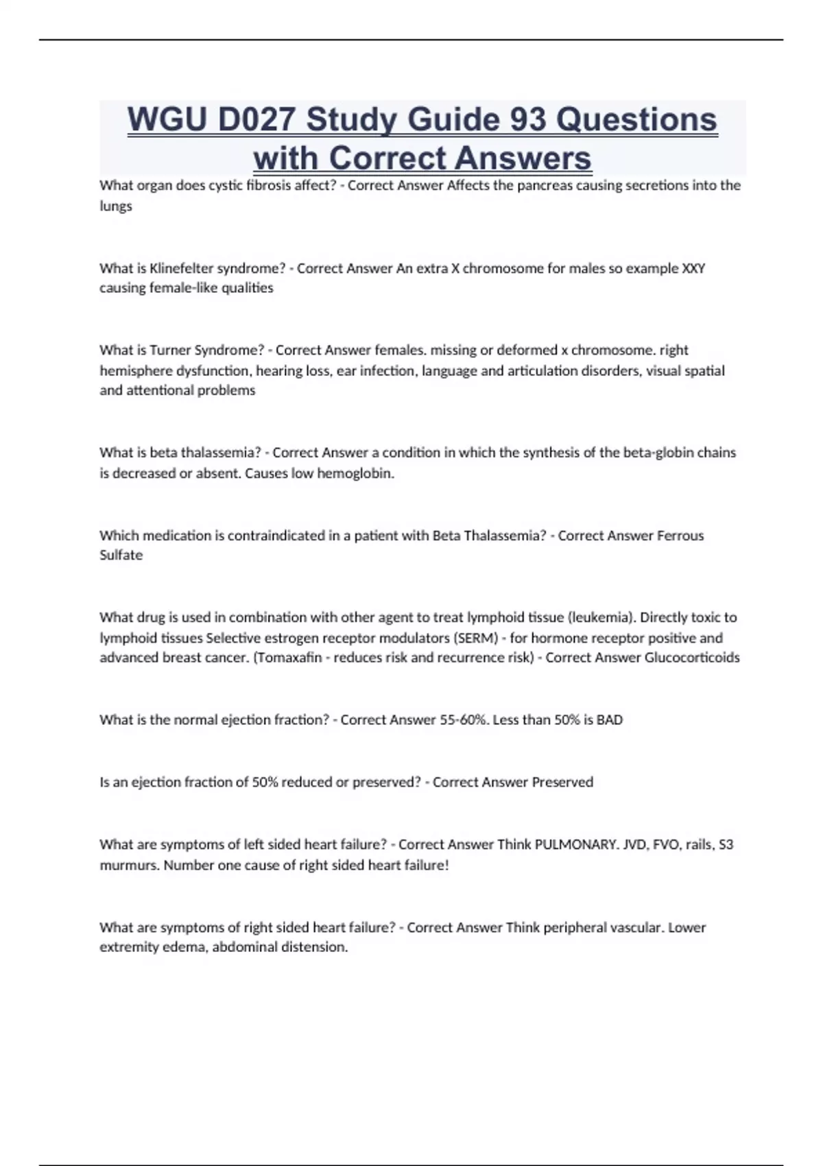 WGU D027 Study Guide 93 Questions with Correct Answers What organ does cystic fibrosis affect? - Correct Answer Affects the pancreas causing secretions into the lungs What is Klinefelter syndrome? - Correct Answer An extra X chromosome for males so example XXY causing female-like qualities What is Turner Syndrome? - Correct Answer females. missing or deformed x chromosome. right hemisphere dysfunction, hearing loss, ear infection, language and articulation disorders, visual spatial and attentional problems What is beta thalassemia? - Correct Answer a condition in which the synthesis of the beta-globin chains is decreased or absent. Causes low hemoglobin. Which medication is contraindicated in a patient with Beta Thalassemia? - Correct Answer Ferrous Sulfate What drug is used in combination with other agent to treat lymphoid tissue (leukemia). Directly toxic to lymphoid tissues Selective estrogen receptor modulators (SERM) - for hormone receptor positive and advanced breast cancer. (Tomaxafin - reduces risk and recurrence risk) - Correct Answer Glucocorticoids What is the normal ejection fraction? - Correct Answer 55-60%. Less than 50% is BAD Is an ejection fraction of 50% reduced or preserved? - Correct Answer Preserved What are symptoms of left sided heart failure? - Correct Answer Think PULMONARY. JVD, FVO, rails, S3 murmurs. Number one cause of right sided heart failure! What are symptoms of right sided heart failure? - Correct Answer Think peripheral vascular. Lower extremity edema, abdominal distension.