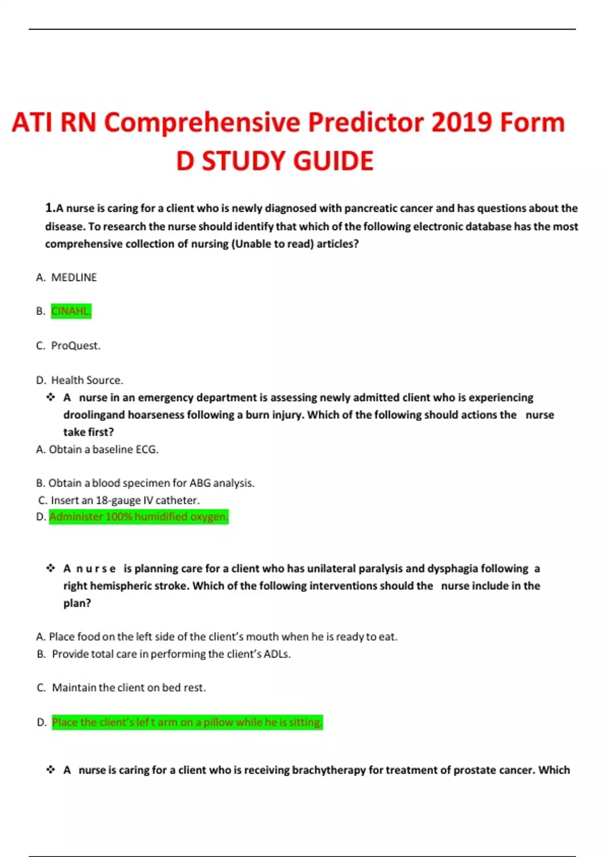 ATI RN Comprehensive Predictor 2019 Form D STUDY GUIDE 1.A nurse is caring for a client who is newly diagnosed with pancreatic cancer and has questions about the disease. To research the nurse should identify that which of the following electronic database hasthe most comprehensive collection of nursing (Unable to read) articles? A. MEDLINE B. CINAHL. C. ProQuest. D. Health Source. A nurse in an emergency department is assessing newly admitted client who is experiencing droolingand hoarseness following a burn injury. Which of the following should actions the nurse take first? A. Obtain a baseline ECG. B. Obtain a blood specimen for ABG analysis. C. Insert an 18-gauge IV catheter. D. Administer 100% humidified oxygen. A n u r s e is planning care for a client who has unilateral paralysis and dysphagia following a right hemispheric stroke. Which of the following interventions should the nurse include in the plan? A. Place food on the left side of the client’s mouth when he isready to eat. B. Provide total care in performing the client’s ADLs. C. Maintain the client on bed rest. D. Place the client’slef t arm on a pillow while he issitting. A nurse is caring for a client who is receiving brachytherapy for treatment of prostate cancer. Which of the following actionsshould the nurse take? Limit the client’s visitorsto 30 min per day. Discard the client’s linens in a double bag. Discard the radioactive source in a biohazard bag Cleanse equipment before removal fromthe client room A nurse is teaching a client about using a 3-point gait for crutch-walking. Which of the following actionsby the client understanding … teaching ? Advancesthe affected leg first priorto the nonaffected leg Uses both crutches when advancing the affected leg Appliesfull weight on the affected side when advancing crutches Planes weight on the axilla when advancing crutches A nurse is admitting a client who is 1 week postpartum and reports excessive vaginal bleeding, the nurse does not speak the same language as the client. The client partner and a 10-year-old child are accompanying her. Which of the following actions should the nurse take to gather the client’s information? Request a female translator interpreter through the facility Ask a student nurse who speaksthe same language to translateHave the child translate Allow the clients child to translate A nurse is caring for a client who is in labor and requires augmentation of labor. Which of the followingconditions should the nurse recognize as a contraindication to the use of oxytocin? A. Diabetes mellitus. Shoulder presentation. Post term withhydramnios. Chorioamnionitis A nurse manager is reviewing the steps of the progressive discipline process prior to counseling a staff member who exhibits unprofessional behavior. Identify the sequence of steps the nurse manager should plan to take in response to the staff members conduct Give the staff member a writing warning about the behavior Verbally remind the staffmember of the expected behavior changes Suspend the staff member from work for several days Dismissthe staff memberfrom employment at the facility Set up a meeting to speak with the staff member about the behavior A nurse is preparing to perform a sterile wound irrigation and dressing change for a client. Which of the following actions by the nurse indicates a break in surgical aseptic technique? Applying a sterile gown after applying a sterile mask Balancing the bottle on the sterile basin while pouring the liquid Placing the supplies on the sterile filed and leaving a 1- inch perimeter Putting on sterile gloves after preparing the sterile field A nurse is assessing a client who has left-sided heart failure. Which of the following should the nurse identify as a manifestation of pulmonary congestion? A. Frothy, pink sputum. B. Jugular vein distention. C. Weight gain. D..Bradypnea