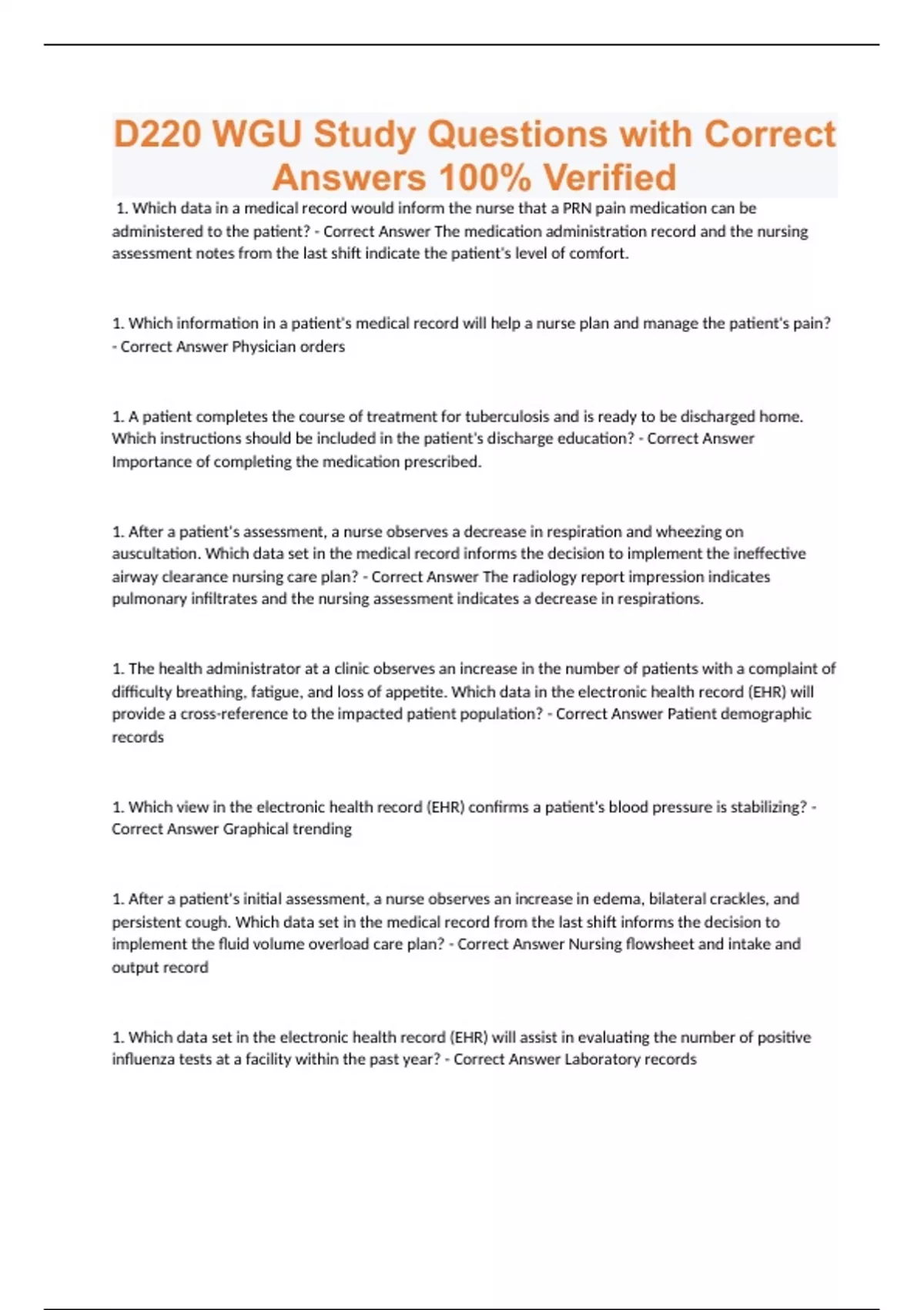 D220 WGU Study Questions with Correct Answers 100% Verified 1. Which data in a medical record would inform the nurse that a PRN pain medication can be administered to the patient? - Correct Answer The medication administration record and the nursing assessment notes from the last shift indicate the patient's level of comfort. 1. Which information in a patient's medical record will help a nurse plan and manage the patient's pain? - Correct Answer Physician orders 1. A patient completes the course of treatment for tuberculosis and is ready to be discharged home. Which instructions should be included in the patient's discharge education? - Correct Answer Importance of completing the medication prescribed. 1. After a patient's assessment, a nurse observes a decrease in respiration and wheezing on auscultation. Which data set in the medical record informs the decision to implement the ineffective airway clearance nursing care plan? - Correct Answer The radiology report impression indicates pulmonary infiltrates and the nursing assessment indicates a decrease in respirations. 1. The health administrator at a clinic observes an increase in the number of patients with a complaint of difficulty breathing, fatigue, and loss of appetite. Which data in the electronic health record (EHR) will provide a cross-reference to the impacted patient population? - Correct Answer Patient demographic records 1. Which view in the electronic health record (EHR) confirms a patient's blood pressure is stabilizing? - Correct Answer Graphical trending 1. After a patient's initial assessment, a nurse observes an increase in edema, bilateral crackles, and persistent cough. Which data set in the medical record from the last shift informs the decision to implement the fluid volume overload care plan? - Correct Answer Nursing flowsheet and intake and output record 1. Which data set in the electronic health record (EHR) will assist in evaluating the number of positive influenza tests at a facility within the past year? - Correct Answer Laboratory records