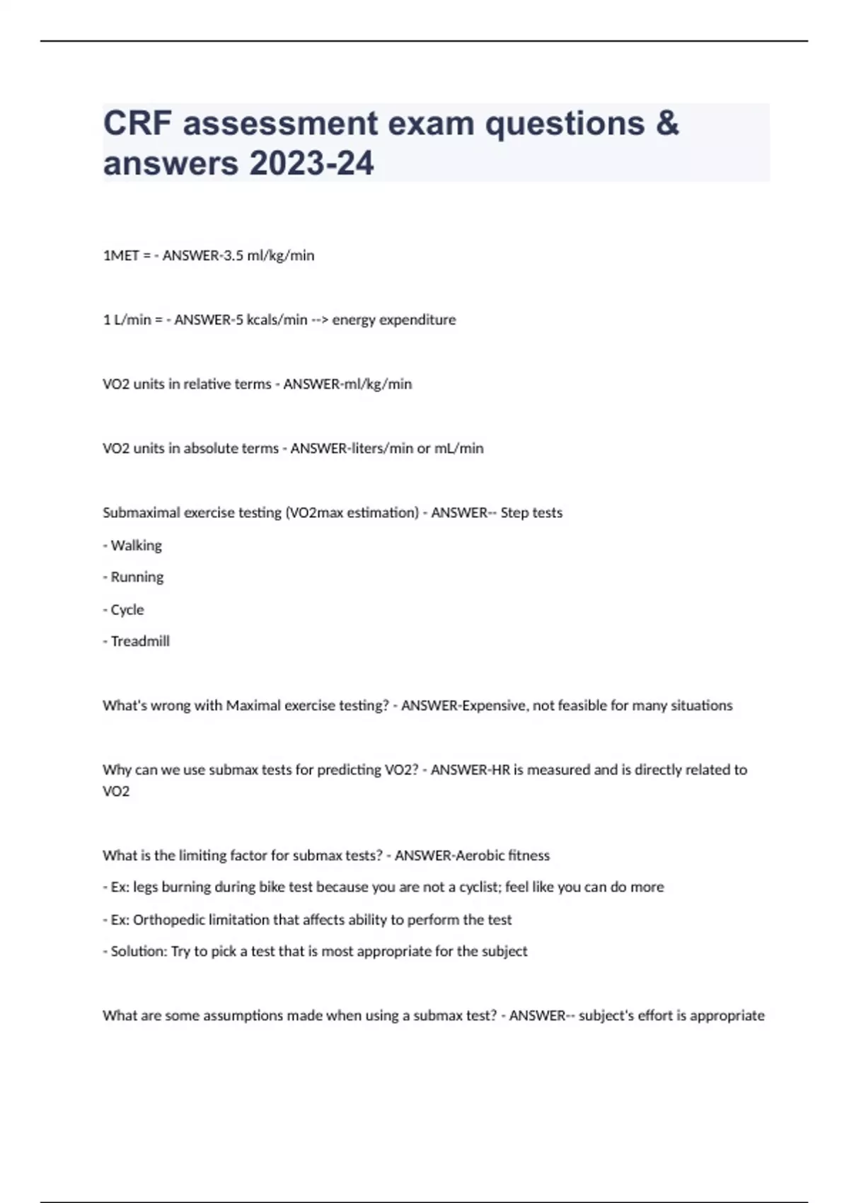 CRF assessment exam questions & answers 2023-24 1MET = - ANSWER-3.5 ml/kg/min 1 L/min = - ANSWER-5 kcals/min --> energy expenditure VO2 units in relative terms - ANSWER-ml/kg/min VO2 units in absolute terms - ANSWER-liters/min or mL/min Submaximal exercise testing (VO2max estimation) - ANSWER-- Step tests - Walking - Running - Cycle - Treadmill What's wrong with Maximal exercise testing? - ANSWER-Expensive, not feasible for many situations Why can we use submax tests for predicting VO2? - ANSWER-HR is measured and is directly related to VO2 What is the limiting factor for submax tests? - ANSWER-Aerobic fitness - Ex: legs burning during bike test because you are not a cyclist; feel like you can do more - Ex: Orthopedic limitation that affects ability to perform the test - Solution: Try to pick a test that is most appropriate for the subject What are some assumptions made when using a submax test? - ANSWER-- subject's effort is appropriate