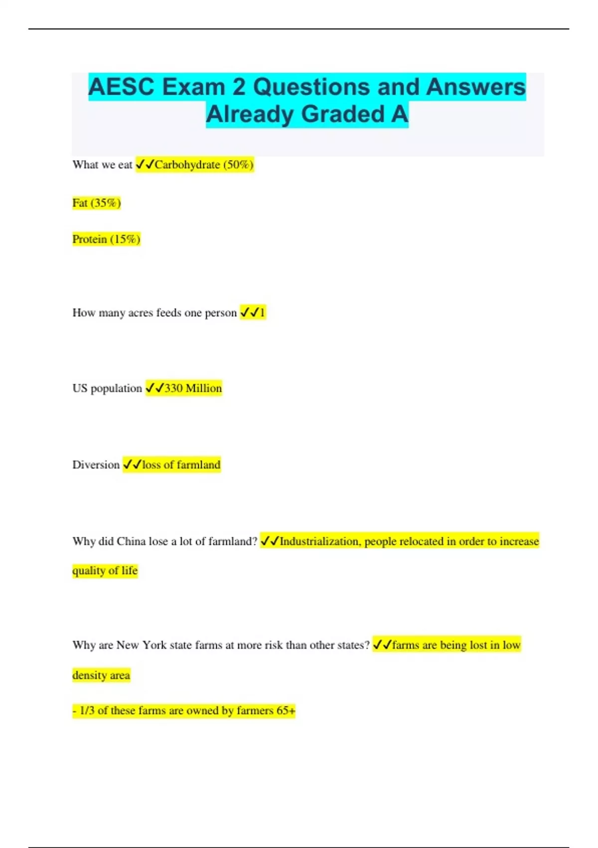AESC Exam 2 Questions and Answers Already Graded A What we eat Carbohydrate (50%) Fat (35%) Protein (15%) How many acres feeds one person 1 US population 330 Million Diversion loss of farmland Why did China lose a lot of farmland? Industrialization, people relocated in order to increase quality of life Why are New York state farms at more risk than other states? farms are being lost in low density area - 1/3 of these farms are owned by farmers 65+ - Loss happens between generations - Covid19 Money allocated to farms since 2011 $83 million Farmland Protection Initiative (2019) $14 million to farms struggling under climate change, covid, federal policy 50% of farmland must be allocated for cattle, hogs, certain crops, maple syrup to be eligible No longer active as of summer 2021 When price index changes... so does food index Supplement to petroleum, way to fuel cars Corn (but you would need A LOT) How many square miles of corn are used to produce ethanol annually? 76,000 US Energy Policy of 2005 and : Required use of 6.5 z 10^9 US gal of renewable, but went up to the 36th to 2022 The Population Bomb explosive growth of population in the future will cause the earth not to have enough resources to sustain us, leading to mass starvation. Paul Ehrlich, predicted to happen in the 70s or 80s. Green Revolution development and spread of technology, plant varieties and agricultural practices Beginnings are often attributed to Norman Borlaug, an American scientist (Mexico-disease, resistant high yield wheat) What did the Green Revolution focus on? high yield, high nutrient varities that responded to fertilizers Antibiotics medicine that inhibits the growth or destroys bacteria, does not work against viruses. How much of antibiotics are used on factory farms? 80% T/F : Bacteria can be found in clean places true T/F : Antibiotics are always long-lasting false Sub-therapeutic Lower doses, longer periods, used to PREVENT infections, limit subclinical infections, improve growth rates, been in. practice since the 1950's antibiotic resistance - ancient phenomenal natural defense mechanism pre-dates coommercial availbility of AB's deeply embedded in bacterial genome Hormone regulatory substance produced in an organims and transported in tissue fluids such as blood or sap to stimulate specific cells or tissues into action or a synthetic substance with an effect similar T/F : Hormones are used in the production of poultry in the United States False, but hormones are used in the production of cattle rBST recombinant bovine somatotropin. naturally occurs in cows, able to be synthesized cheaply from bacteria and isolated, inject cows and make more milk with it. The world is in an uproar because of it. r Primary nutrients NPK on fertilizer (Nitrogen, phosphorus and potassium) Secondary nutrients calcium, magnesium, and sulfur Micronutrients copper, iron, manganese, zinc, nickel, boron and vanadium Eutrophication excessive richness of nutrients in a lake or other body of water, frequently due to runoff from the land, which causes a dense growth of plant life and death of animal life from lack of oxygen. night soil human poop used as fertilizer GMO Genetically modified organism made when DNA is removed from one organism and placed within the DNA of what can be a very different organism. Pathos Appeal to emotion Logos appeal to logic Ethos appeal to credibility Most product advertisement focus on extrinisc/intrinsic values? Extrinsic Most persusasive advertisements focus on extrinisic/intrinsic values? intrinsic Implicative Advertising Implying that others (competitors) engage in some activity through one's own denial nusiance actions considered a supplement to regulation and itrigation under the environmental law International Politics - protect against trade policy -international trade agreements -Famines and aid -political instability -climate change NAFTA international trade agreement between US, Canada and Mexico. Eliminated tariffs between the three countries 1994 US Trade Agreement Bait and Switch Advertising a dishonest tactic where a salesperson lures someone into the store with a promise of a bargain What does Juanfra do? He is the corperate head of food safety with Wayne Farms Where is Juanfra from? Lima, Peru Where did Juanfra go to school? The National Agriculture University of La Molina in Lima, Peru (it has only 4,000 students but that is huge in Peru) Where did Juanfra learn English and how long did it take him? He learned it in Minnesota and he learned it in 4 months! Juanfra eventually got a job with what company at which position? Perdue Farms as production supervisor; 3 months later he became quality assurance supervisor Which extrinsic value do Food Fads fit in to? Conformity What emerges because of the corn diet in cows? E. Coli What do humans crave? (this is rare in nature) salt, fat, and sugar Where is the largest slaughterhouse in the world located and what is it called? Smithfield and it is called Tar Hill SNP Special nutrient program (by Food and Nutrition Service Programs) - national school lunch program -school breakfast program WIC Women, Infants, and Children (food and nutrient service program) - administered throuhg local health departments and includes nutrition counseling -feature use vouchers SNAP Supplemental Nutrition Assistance Program (formerly known as food stamps) Oldest of the USDA Departments Food and Nutrition Service (FNS) Approval for SNAP benefits -household size -your expenses -your income Net monthly income for a family of 4 2,025 Maximum monthly SNAP benefit one person can receive? $194 Average SNAP benefit per person $127 How many people does SNAP serve 40 million Americans or 12% of the United States In 2012, how much of Georgia's population received SNAP benefits? 20% and we were the 6th highest in the country Nuisance Actions - considered a supplement to regulation and litigation under environmental laws - actions are used to determine if the use of the property 