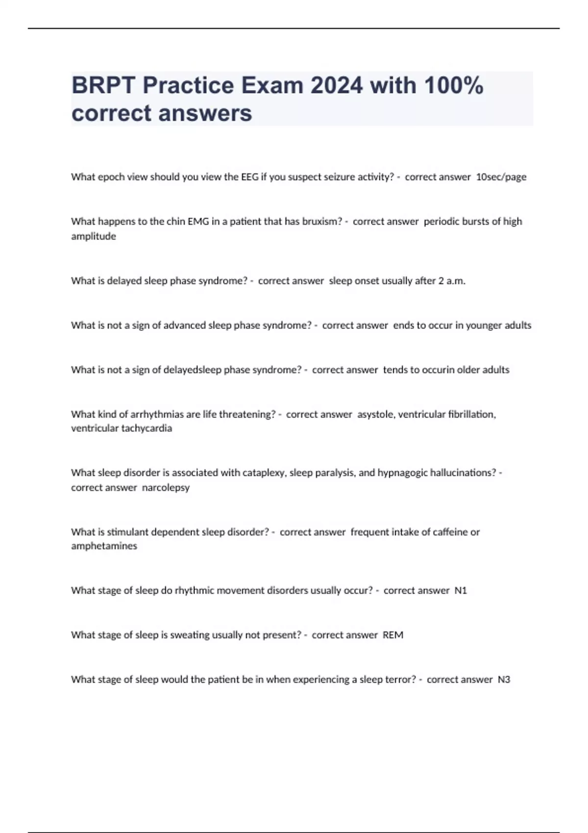 What epoch view should you view the EEG if you suspect seizure activity? - correct answer 10sec/page What happens to the chin EMG in a patient that has bruxism? - correct answer periodic bursts of high amplitude What is delayed sleep phase syndrome? - correct answer sleep onset usually after 2 a.m. What is not a sign of advanced sleep phase syndrome? - correct answer ends to occur in younger adults What is not a sign of delayedsleep phase syndrome? - correct answer tends to occurin older adults