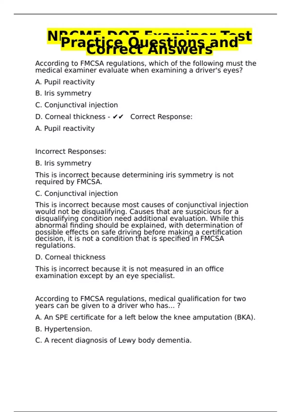 According to FMCSA regulations, which of the following must the medical examiner evaluate when examining a driver's eyes? A. Pupil reactivity B. Iris symmetry C. Conjunctival injection D. Corneal thickness - Correct Response: A. Pupil reactivity Incorrect Responses: B. Iris symmetry This is incorrect because determining iris symmetry is not required by FMCSA. C. Conjunctival injection This is incorrect because most causes of conjunctival injection would not be disqualifying. Causes that are suspicious for a disqualifying condition need additional evaluation. While this abnormal finding should be explained, with determination of possible effects on safe driving before making a certification decision, it is not a condition that is specified in FMCSA regulations. D. Corneal thickness This is incorrect because it is not measured in an office examination except by an eye specialist. According to FMCSA regulations, medical qualification for two years can be given to a driver who has... ? A. An SPE certificate for a left below the knee amputation (BKA). B. Hypertension. C. A recent diagnosis of Lewy body dementia. D. Documented medical marijuana use for pain control. - Correct Response: A. An SPE certificate for a left below the knee amputation.This is the correct response because in order to obtain the SPE certificate, the driver had to demonstrate the ability to perform all tasks for the commercial driver job description. Incorrect Responses: B. Hypertension. This is not the correct response because drivers with hypertension are only given a medical certificate that is good for one year. C. A recent diagnosis of Lewy body dementia. This is not the correct response because this is a progressive, degenerative condition with no known treatment. The effects of Lewy body dementia impact the ability to operate a CMV safely. D. Documented medical marijuana use for pain control. This is not the correct response because marijuana remains a drug listed in Schedule I of the Controlled Substances Act. It remains unacceptable for any safety-sensitive employee subject to drug testing under the drug testing regulations of DOT to use marijuana. Also, FMCSA medical guidelines state that "driving impairment due to marijuana use is well substantiated." During his visit to the medical examiner, a driver complains of severe pain in his finger for the last two weeks after it was punctured. The examination reveals an infected, swollen finger. After the medical examiner inquiries, the driver states that the pain is made worse when he grips the steering wheel. Which of the following should the medical examiner do next? A. Obtain a hand X-ray. B. Assess capillary refill in the hand. C. Obtain a culture and sensitivity. D. Assess the driver's grip strength. - Correct Response: D. Assess the driver's grip strength.This is the correct response because the condition does not present a safety risk unless it interferes with the ability of the driver to hold and control the steering wheel. Incorrect Responses: A. Obtain a hand X-ray. This is not the correct response because this is a diagnostic test that a healthcare provider or specialist would perform or order. Your role as a medical examiner is to determine if the condition interferes with the ability of the driver to safely operate a CMV. B. Assess capillary refill in the hand. This is not the correct response because given the information in the question it is not the primary consideration for determining if the driver can safely operate a CMV. C. Obtain a culture and sensitivity. This is not the correct response because this is an action that a treating healthcare provider or specialist would do in the course workup and treatment- Your role as a medical examiner is to determine if the condition interferes with the ability of the driver to safely operate a CMV. A new driver who had a myocardial infarction six months ago is certified after completing an acceptable exercise tolerance test and is cleared by a cardiologist. According to FMCSA guidelines, which of the following is recommended regarding recertification and exercise tolerance test monitoring intervals? Recertification / Exercise tolerance A. Every year / Every year B. Every two years / Every year C. Every year / Every two years D. Every two years / Every two years - Correct Response: C. Every year / Every two years This is the correct response because according to FMCSA medical guidelines, when a myocardial infarction is part of the medical history, there is a significant increased risk for another myocardial infarction to occur within six months to a year; therefore, a maximum of one-year certification is the guideline. Myocardial infarction guidelines also recommend exercise tolerance testing at least every two years to demonstrate continued ability to safely operate a CMV.