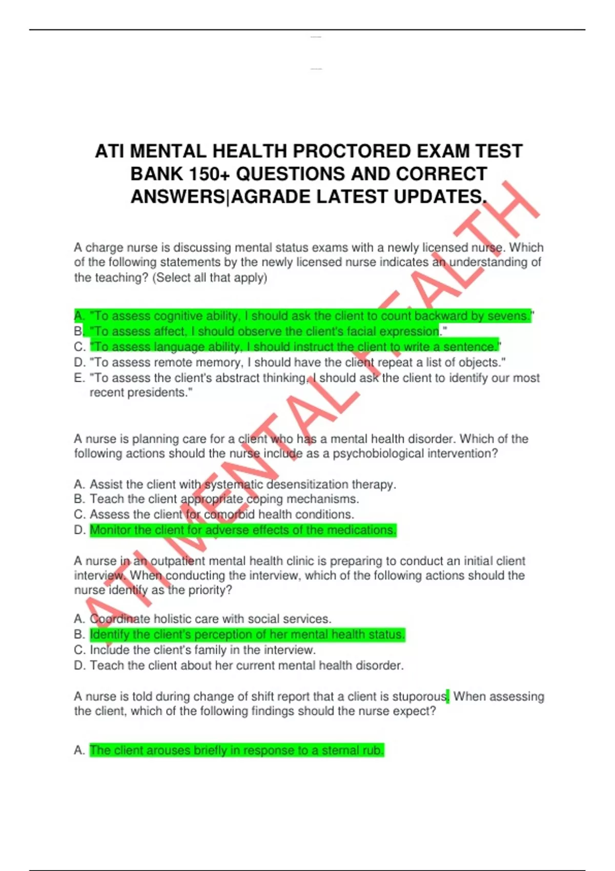 ATI MENTAL HEALTH PROCTORED EXAM TEST BANK 150+ QUESTIONS AND CORRECT ANSWERS|AGRADE LATEST UPDATES