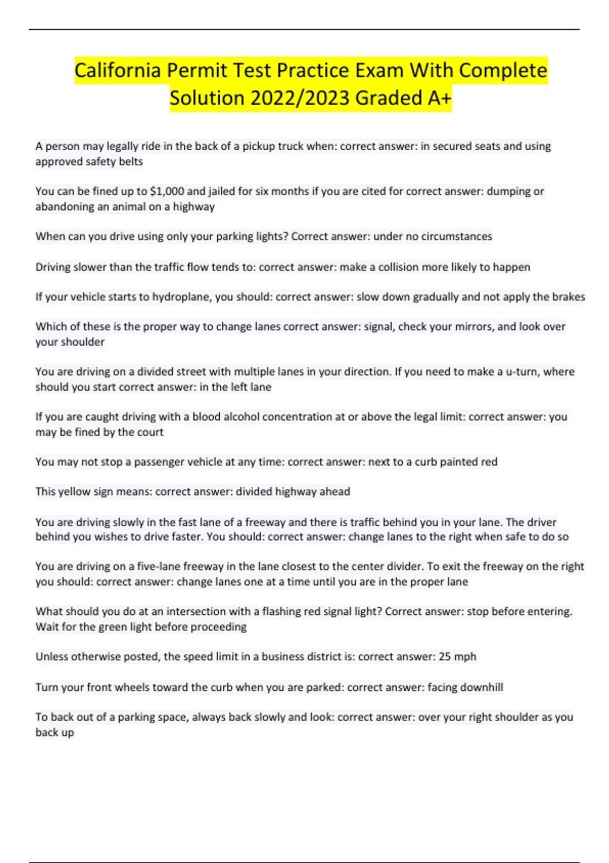 California Permit Test Practice Exam With Complete Solution 2022/2023 Graded A+