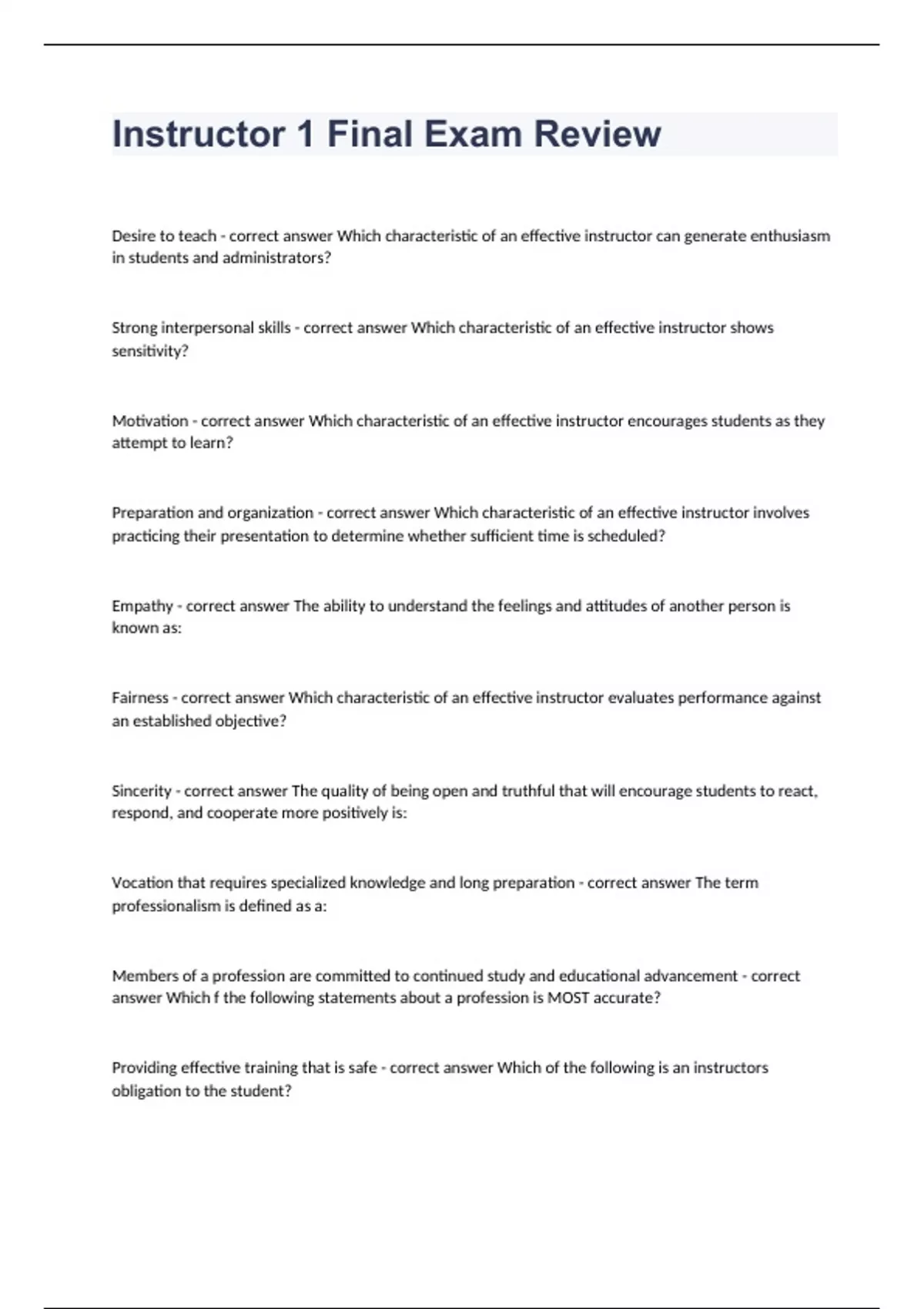 Instructor 1 Final Exam ReviewDesire to teach - correct answer Which characteristic of an effective instructor can generate enthusiasm in students and administrators? Strong interpersonal skills - correct answer Which characteristic of an effective instructor shows sensitivity? Motivation - correct answer Which characteristic of an effective instructor encourages students as they attempt to learn? Preparation and organization - correct answer Which characteristic of an effective instructor involves practicing their presentation to determine whether sufficient time is scheduled? Empathy - correct answer The ability to understand the feelings and attitudes of another person is known as: Fairness - correct answer Which characteristic of an effective instructor evaluates performance against an established objective? Sincerity - correct answer The quality of being open and truthful that will encourage students to react, respond, and cooperate more positively is: Vocation that requires specialized knowledge and long preparation - correct answer The term professionalism is defined as a: Members of a profession are committed to continued study and educational advancement - correct answer Which f the following statements about a profession is MOST accurate? Providing effective training that is safe - correct answer Which of the following is an instructors obligation to the student?