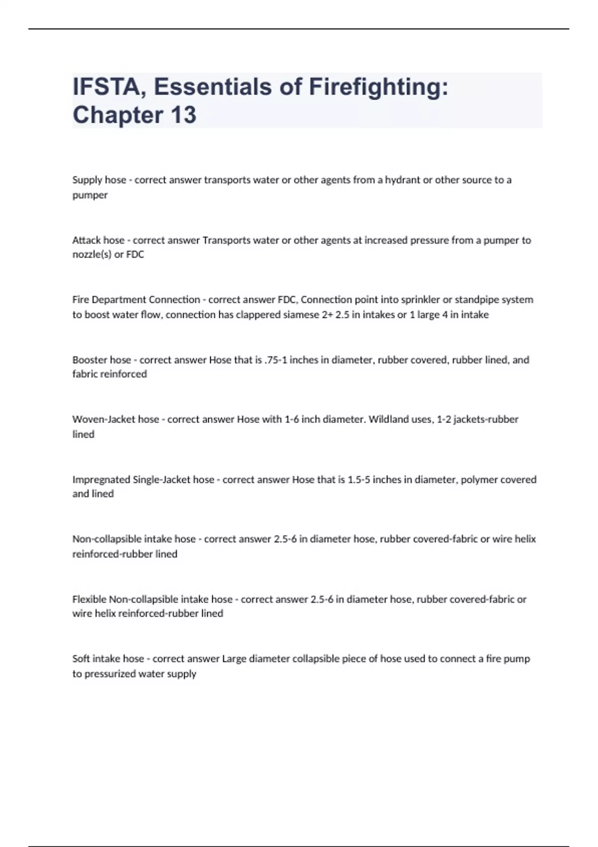 IFSTA, Essentials of Firefighting: Chapter 13Supply hose - correct answer transports water or other agents from a hydrant or other source to a pumper Attack hose - correct answer Transports water or other agents at increased pressure from a pumper to nozzle(s) or FDC Fire Department Connection - correct answer FDC, Connection point into sprinkler or standpipe system to boost water flow, connection has clappered siamese 2+ 2.5 in intakes or 1 large 4 in intake Booster hose - correct answer Hose that is .75-1 inches in diameter, rubber covered, rubber lined, and fabric reinforced Woven-Jacket hose - correct answer Hose with 1-6 inch diameter. Wildland uses, 1-2 jackets-rubber lined Impregnated Single-Jacket hose - correct answer Hose that is 1.5-5 inches in diameter, polymer covered and lined Non-collapsible intake hose - correct answer 2.5-6 in diameter hose, rubber covered-fabric or wire helix reinforced-rubber lined Flexible Non-collapsible intake hose - correct answer 2.5-6 in diameter hose, rubber covered-fabric or wire helix reinforced-rubber lined Soft intake hose - correct answer Large diameter collapsible piece of hose used to connect a fire pump to pressurized water supply