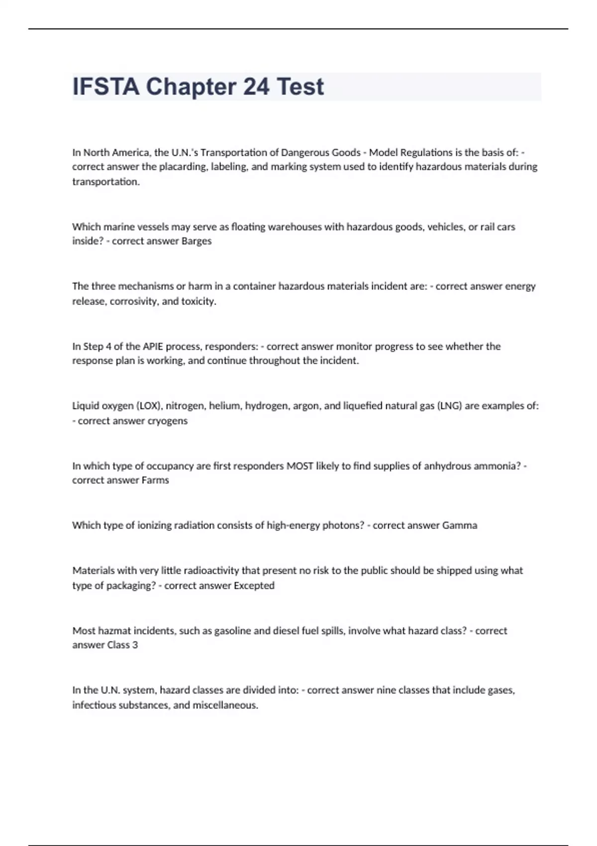 IFSTA Chapter 24 TestIn North America, the U.N.'s Transportation of Dangerous Goods - Model Regulations is the basis of: - correct answer the placarding, labeling, and marking system used to identify hazardous materials during transportation. Which marine vessels may serve as floating warehouses with hazardous goods, vehicles, or rail cars inside? - correct answer Barges The three mechanisms or harm in a container hazardous materials incident are: - correct answer energy release, corrosivity, and toxicity. In Step 4 of the APIE process, responders: - correct answer monitor progress to see whether the response plan is working, and continue throughout the incident. Liquid oxygen (LOX), nitrogen, helium, hydrogen, argon, and liquefied natural gas (LNG) are examples of: - correct answer cryogens In which type of occupancy are first responders MOST likely to find supplies of anhydrous ammonia? - correct answer Farms Which type of ionizing radiation consists of high-energy photons? - correct answer Gamma Materials with very little radioactivity that present no risk to the public should be shipped using what type of packaging? - correct answer Excepted Most hazmat incidents, such as gasoline and diesel fuel spills, involve what hazard class? - correct answer Class 3 In the U.N. system, hazard classes are divided into: - correct answer nine classes that include gases, infectious substances, and miscellaneous. A boiling liquid expanding vapor explosion (BLEVE) is caused by: - correct answer a heated liquid or gas expanding. In addition to burning, all flammable and combustible liquids exhibit varying degrees of: - correct answer toxicity. Which method of detecting the presence of hazardous materials would pose the least risk for a first responder? - correct answer Referring to a preincident survey of the facility Locations such as ports, docks, railroad sidings, airplane hangars, and truck terminals: - correct answer are likely locations for hazmat incidents. The damaging effects of ionizing radiation occur at the _____ level. - correct answer cellular Small airborne particles of solid substances such as grain, flour, sugar, coal, metal, or sawdust: - correct answer can ignite or explode. Which statement about gases is most accurate? - correct answer Gases have an undefined shape and keep expanding if uncontained. What is a descriptive name, identification number, weight, or specification that includes instructions, cautions, or U.N. marks, and is required on outer packaging of hazardous materials? - correct answer Marking A fuel that has moved beyond its upper flammable limit will: - correct answer be too rich to burn. Which statement about pipelines is MOST accurate? - correct answer Pipeline companies must provide markers where pipelines cross under (or over) railroads or waterways. What are some reasons that preincident surveys might not be accurate or useful in a hazmat incident? - correct answer Inventories, businesses, or other factors may change without notice.