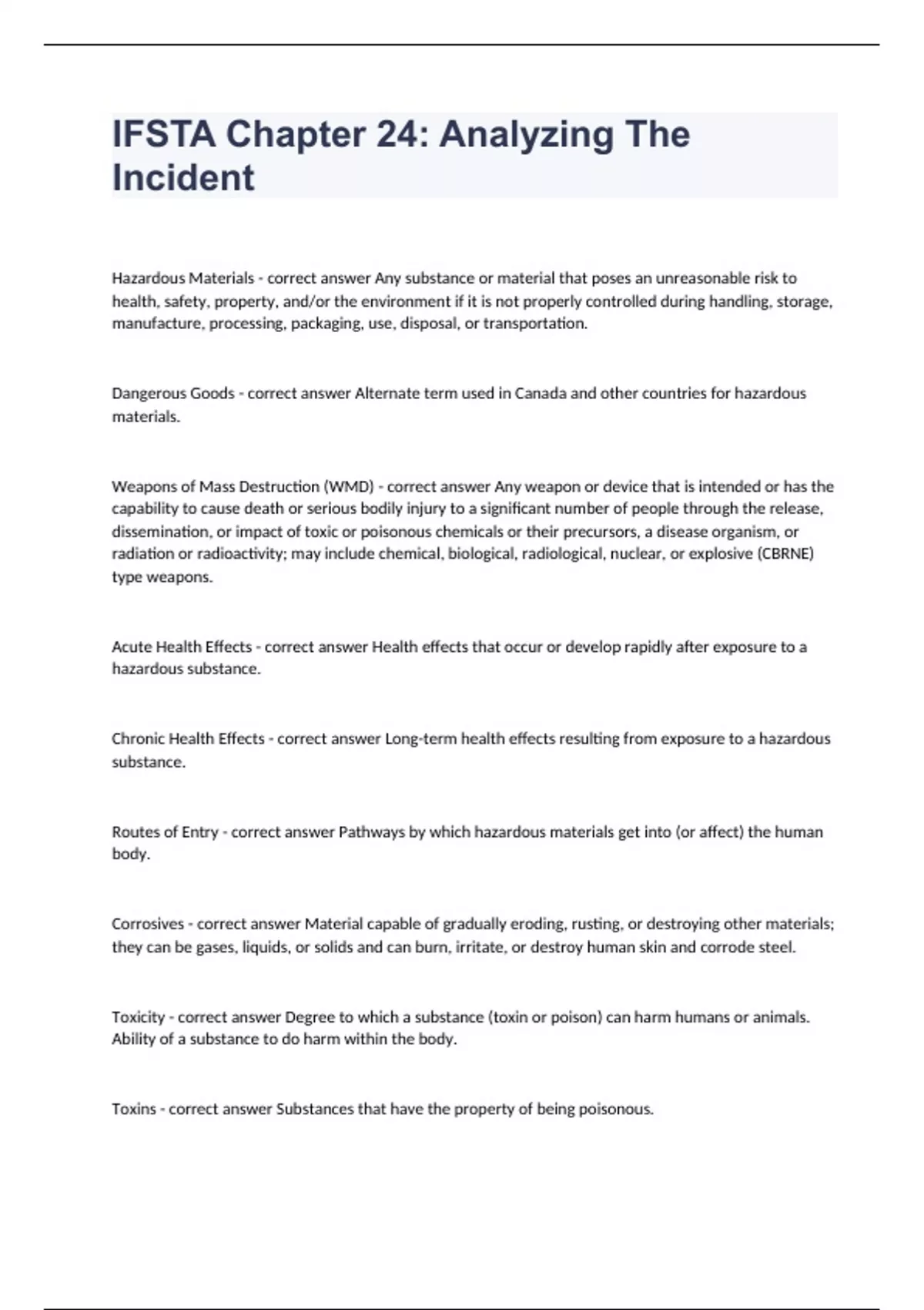 IFSTA Chapter 24: Analyzing The IncidentHazardous Materials - correct answer Any substance or material that poses an unreasonable risk to health, safety, property, and/or the environment if it is not properly controlled during handling, storage, manufacture, processing, packaging, use, disposal, or transportation. Dangerous Goods - correct answer Alternate term used in Canada and other countries for hazardous materials. Weapons of Mass Destruction (WMD) - correct answer Any weapon or device that is intended or has the capability to cause death or serious bodily injury to a significant number of people through the release, dissemination, or impact of toxic or poisonous chemicals or their precursors, a disease organism, or radiation or radioactivity; may include chemical, biological, radiological, nuclear, or explosive (CBRNE) type weapons. Acute Health Effects - correct answer Health effects that occur or develop rapidly after exposure to a hazardous substance. Chronic Health Effects - correct answer Long-term health effects resulting from exposure to a hazardous substance. Routes of Entry - correct answer Pathways by which hazardous materials get into (or affect) the human body. Corrosives - correct answer Material capable of gradually eroding, rusting, or destroying other materials; they can be gases, liquids, or solids and can burn, irritate, or destroy human skin and corrode steel. Toxicity - correct answer Degree to which a substance (toxin or poison) can harm humans or animals. Ability of a substance to do harm within the body. Toxins - correct answer Substances that have the property of being poisonous.