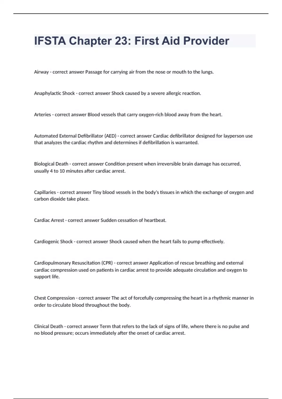 IFSTA Chapter 23: First Aid Provider Airway - correct answer Passage for carrying air from the nose or mouth to the lungs. Anaphylactic Shock - correct answer Shock caused by a severe allergic reaction. Arteries - correct answer Blood vessels that carry oxygen-rich blood away from the heart. Automated External Defibrillator (AED) - correct answer Cardiac defibrillator designed for layperson use that analyzes the cardiac rhythm and determines if defibrillation is warranted. Biological Death - correct answer Condition present when irreversible brain damage has occurred, usually 4 to 10 minutes after cardiac arrest. Capillaries - correct answer Tiny blood vessels in the body's tissues in which the exchange of oxygen and carbon dioxide take place. Cardiac Arrest - correct answer Sudden cessation of heartbeat. Cardiogenic Shock - correct answer Shock caused when the heart fails to pump effectively. Cardiopulmonary Resuscitation (CPR) - correct answer Application of rescue breathing and external cardiac compression used on patients in cardiac arrest to provide adequate circulation and oxygen to support life. Chest Compression - correct answer The act of forcefully compressing the heart in a rhythmic manner in order to circulate blood throughout the body. Clinical Death - correct answer Term that refers to the lack of signs of life, where there is no pulse and no blood pressure; occurs immediately after the onset of cardiac arrest.