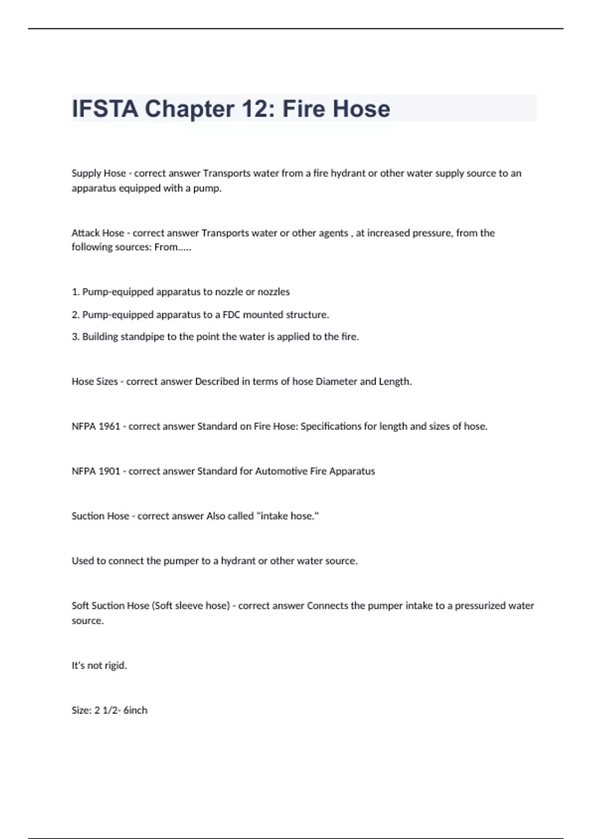IFSTA Chapter 12: Fire HoseSupply Hose - correct answer Transports water from a fire hydrant or other water supply source to an apparatus equipped with a pump. Attack Hose - correct answer Transports water or other agents , at increased pressure, from the following sources: From..... 1. Pump-equipped apparatus to nozzle or nozzles 2. Pump-equipped apparatus to a FDC mounted structure. 3. Building standpipe to the point the water is applied to the fire. Hose Sizes - correct answer Described in terms of hose Diameter and Length. NFPA 1961 - correct answer Standard on Fire Hose: Specifications for length and sizes of hose. NFPA 1901 - correct answer Standard for Automotive Fire Apparatus Suction Hose - correct answer Also called "intake hose." Used to connect the pumper to a hydrant or other water source. Soft Suction Hose (Soft sleeve hose) - correct answer Connects the pumper intake to a pressurized water source. It's not rigid. Size: 2 1/2- 6inch