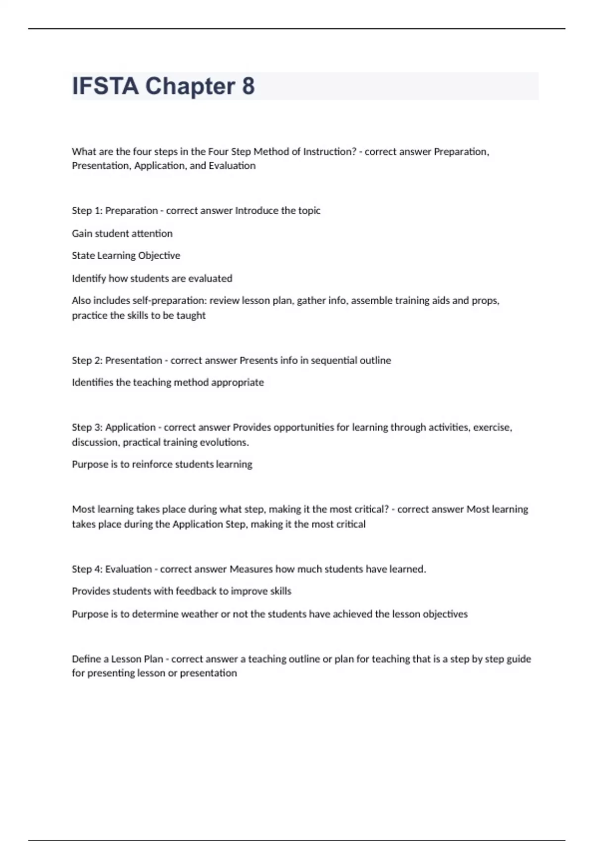 IFSTA Chapter 8 What are the four steps in the Four Step Method of Instruction? - correct answer Preparation, Presentation, Application, and Evaluation Step 1: Preparation - correct answer Introduce the topic Gain student attention State Learning Objective Identify how students are evaluated Also includes self-preparation: review lesson plan, gather info, assemble training aids and props, practice the skills to be taught Step 2: Presentation - correct answer Presents info in sequential outline Identifies the teaching method appropriate Step 3: Application - correct answer Provides opportunities for learning through activities, exercise, discussion, practical training evolutions. Purpose is to reinforce students learning Most learning takes place during what step, making it the most critical? - correct answer Most learning takes place during the Application Step, making it the most critical Step 4: Evaluation - correct answer Measures how much students have learned. Provides students with feedback to improve skills Purpose is to determine weather or not the students have achieved the lesson objectives Define a Lesson Plan - correct answer a teaching outline or plan for teaching that is a step by step guide for presenting lesson or presentation