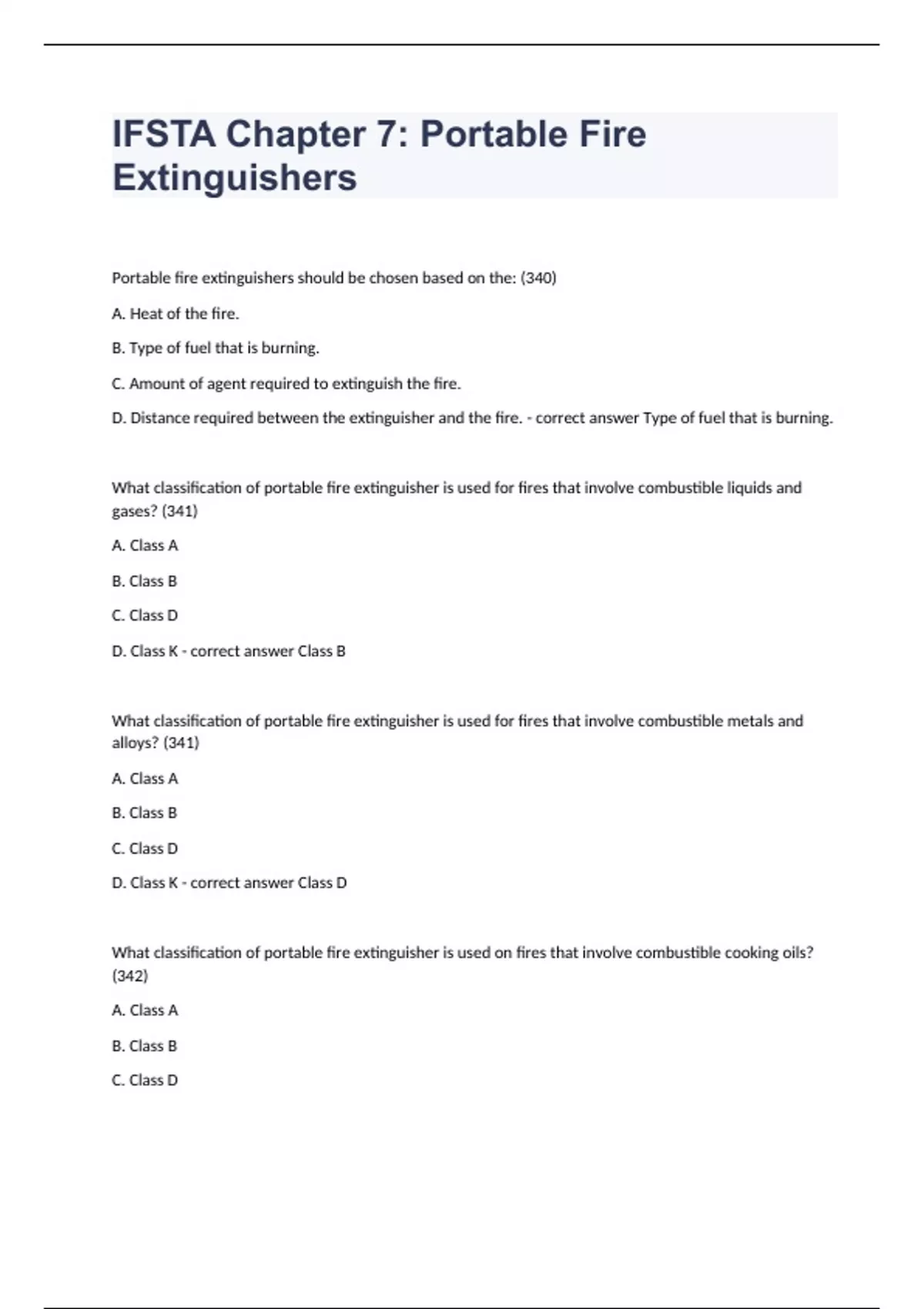 IFSTA Chapter 7: Portable Fire ExtinguishersPortable fire extinguishers should be chosen based on the: (340) A. Heat of the fire. B. Type of fuel that is burning. C. Amount of agent required to extinguish the fire. D. Distance required between the extinguisher and the fire. - correct answer Type of fuel that is burning. What classification of portable fire extinguisher is used for fires that involve combustible liquids and gases? (341) A. Class A B. Class B C. Class D D. Class K - correct answer Class B What classification of portable fire extinguisher is used for fires that involve combustible metals and alloys? (341) A. Class A B. Class B C. Class D D. Class K - correct answer Class D What classification of portable fire extinguisher is used on fires that involve combustible cooking oils? (342) A. Class A B. Class B C. Class D