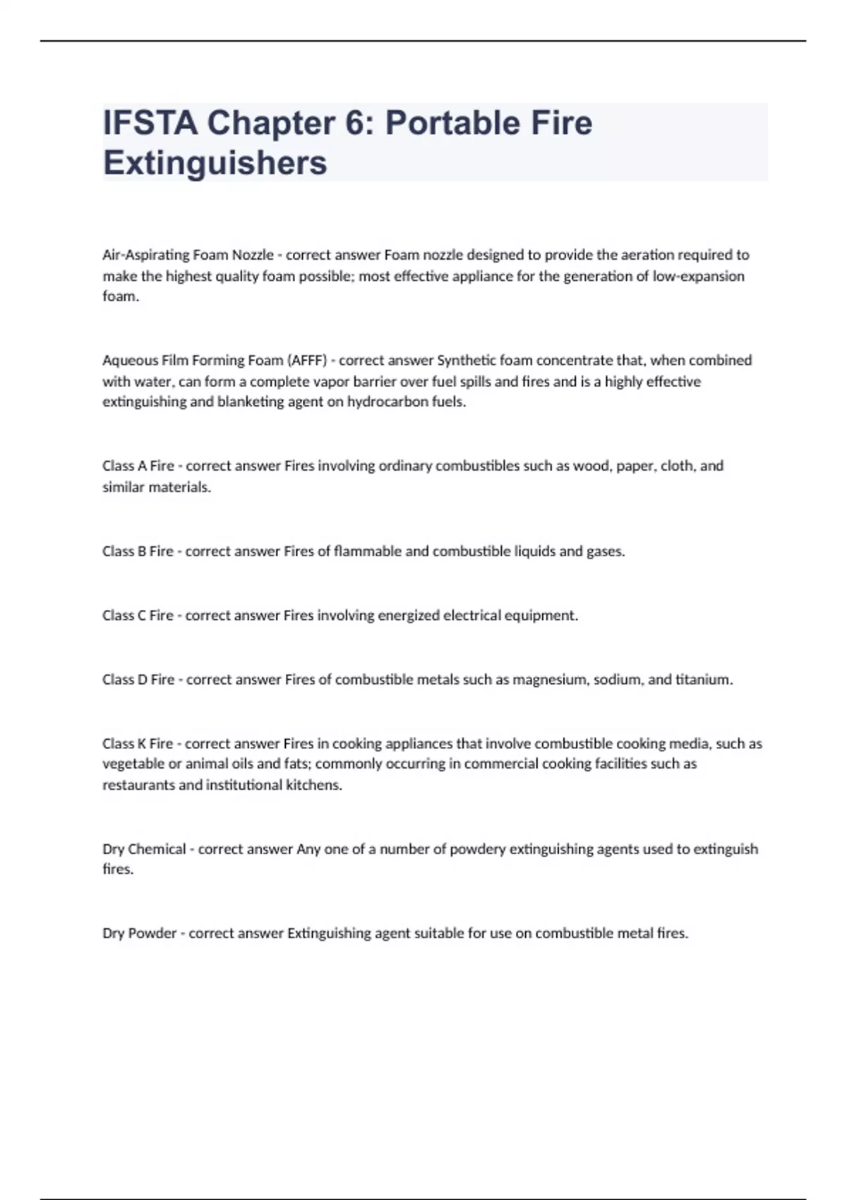 IFSTA Chapter 6: Portable Fire ExtinguishersAir-Aspirating Foam Nozzle - correct answer Foam nozzle designed to provide the aeration required to make the highest quality foam possible; most effective appliance for the generation of low-expansion foam. Aqueous Film Forming Foam (AFFF) - correct answer Synthetic foam concentrate that, when combined with water, can form a complete vapor barrier over fuel spills and fires and is a highly effective extinguishing and blanketing agent on hydrocarbon fuels. Class A Fire - correct answer Fires involving ordinary combustibles such as wood, paper, cloth, and similar materials. Class B Fire - correct answer Fires of flammable and combustible liquids and gases. Class C Fire - correct answer Fires involving energized electrical equipment. Class D Fire - correct answer Fires of combustible metals such as magnesium, sodium, and titanium. Class K Fire - correct answer Fires in cooking appliances that involve combustible cooking media, such as vegetable or animal oils and fats; commonly occurring in commercial cooking facilities such as restaurants and institutional kitchens. Dry Chemical - correct answer Any one of a number of powdery extinguishing agents used to extinguish fires.
