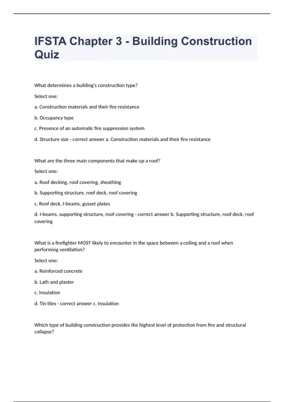 IFSTA Chapter 3 - Building Construction QuizWhat determines a building's construction type? Select one: a. Construction materials and their fire resistance b. Occupancy type c. Presence of an automatic fire suppression system d. Structure size - correct answer a. Construction materials and their fire resistance What are the three main components that make up a roof? Select one: a. Roof decking, roof covering, sheathing b. Supporting structure, roof deck, roof covering c. Roof deck, I-beams, gusset plates d. I-beams, supporting structure, roof covering - correct answer b. Supporting structure, roof deck, roof covering What is a firefighter MOST likely to encounter in the space between a ceiling and a roof when performing ventilation? Select one: a. Reinforced concrete b. Lath and plaster c. Insulation d. Tin tiles - correct answer c. Insulation Which type of building construction provides the highest level of protection from fire and structural collapse? Select one: a. Type II b. Type I c. Type IV d. Type V - correct answer b. Type I When a building has no windows or has windows that cannot be opened: Select one: a. forcible entry may be easier. b. suppression team access may be less difficult. c. access and egress will be impossible. d. tactical ventilation may be more difficult. - correct answer d. tactical ventilation may be more difficult. Roof penetrations such as skylights and chimneys: Select one: a. may act as an exit point for some types of ventilation. b. are usually only encountered on pitched residential roofs. c. are extremely difficult to penetrate when performing ventilation. d. do not affect ventilation in any way. - correct answer a. may act as an exit point for some types of ventilation. Which type of factory-built home is the least expensive, and usually has wheels and a permanent steel undercarriage? Select one: a. Mobile home b. Modular home c. Log houses d. Geodesic domes - correct answer a. Mobile home