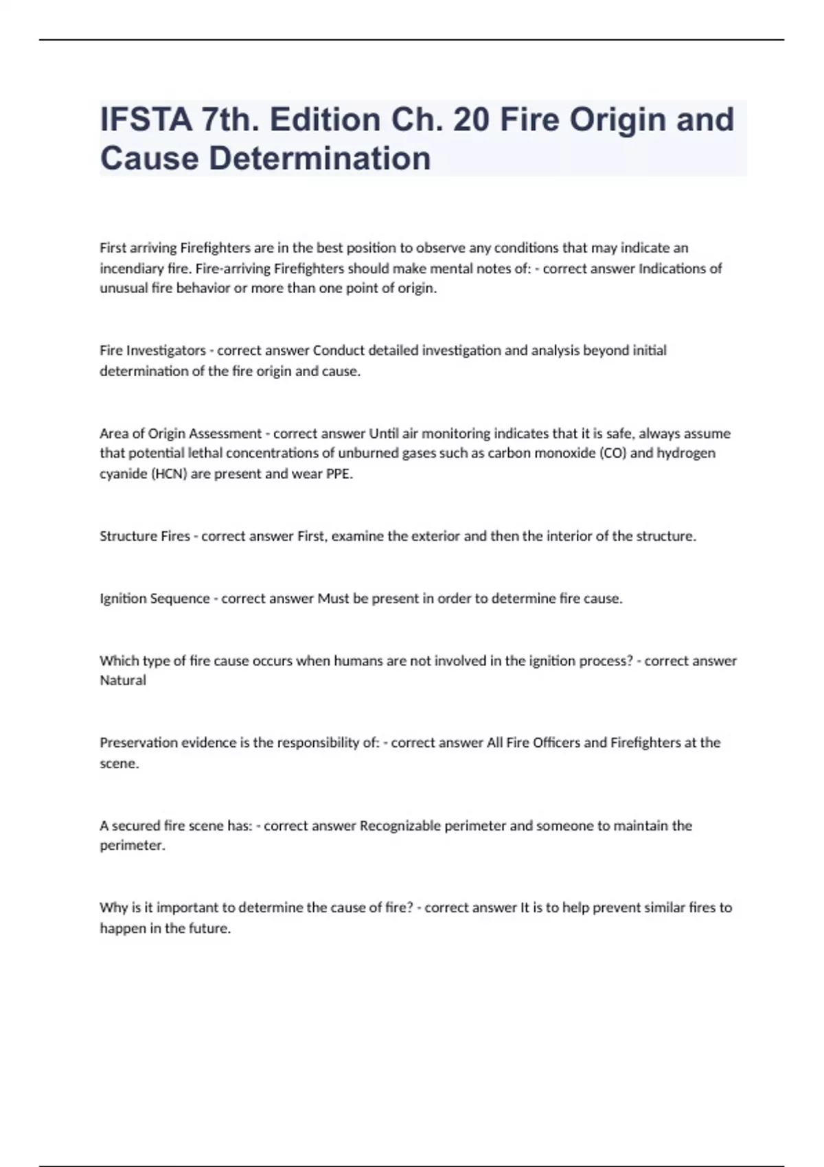 IFSTA 7th. Edition Ch. 20 Fire Origin and Cause Determination First arriving Firefighters are in the best position to observe any conditions that may indicate an incendiary fire. Fire-arriving Firefighters should make mental notes of: - correct answer Indications of unusual fire behavior or more than one point of origin. Fire Investigators - correct answer Conduct detailed investigation and analysis beyond initial determination of the fire origin and cause. Area of Origin Assessment - correct answer Until air monitoring indicates that it is safe, always assume that potential lethal concentrations of unburned gases such as carbon monoxide (CO) and hydrogen cyanide (HCN) are present and wear PPE. Structure Fires - correct answer First, examine the exterior and then the interior of the structure. Ignition Sequence - correct answer Must be present in order to determine fire cause. Which type of fire cause occurs when humans are not involved in the ignition process? - correct answer Natural Preservation evidence is the responsibility of: - correct answer All Fire Officers and Firefighters at the scene. A secured fire scene has: - correct answer Recognizable perimeter and someone to maintain the perimeter. Why is it important to determine the cause of fire? - correct answer It is to help prevent similar fires to happen in the future.