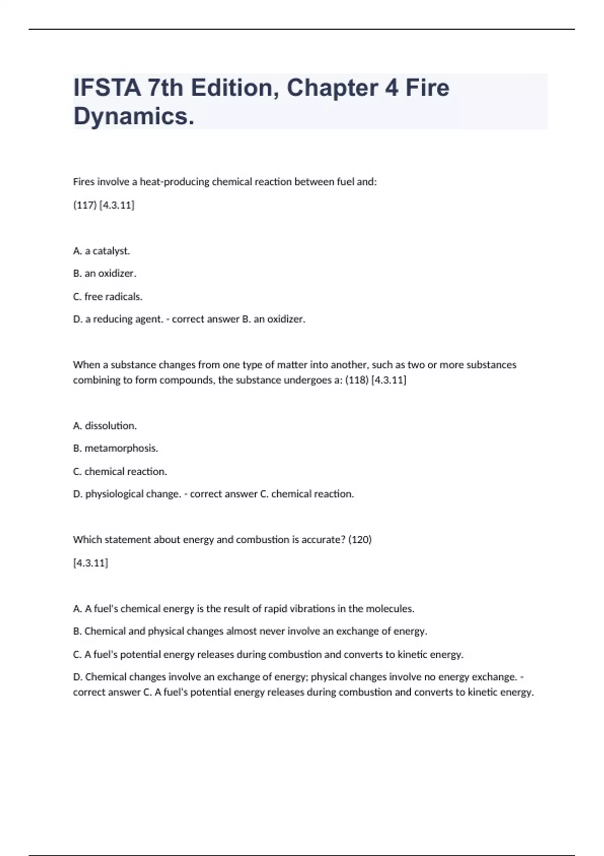 D. Chemical changes involve an exchange of energy; physical changes involve no energy exchange. - correct answer C. A fuel's potential energy releases during combustion and converts to kinetic energy. Which element of the fire tetrahedron is included to explain flaming (gas-phase) combustion? (120) [4.3.11]