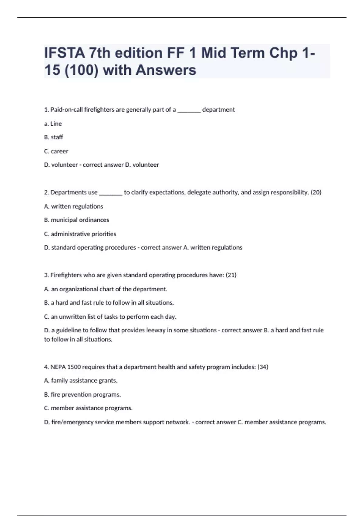 IFSTA 7th edition FF 1 Mid Term Chp 1-15 (100) with Answers1. Paid-on-call firefighters are generally part of a _______ department a. Line B. staff C. career D. volunteer - correct answer D. volunteer 2. Departments use _______ to clarify expectations, delegate authority, and assign responsibility. (20) A. written regulations B. municipal ordinances C. administrative priorities D. standard operating procedures - correct answer A. written regulations 3. Firefighters who are given standard operating procedures have: (21) A. an organizational chart of the department. B. a hard and fast rule to follow in all situations. C. an unwritten list of tasks to perform each day. D. a guideline to follow that provides leeway in some situations - correct answer B. a hard and fast rule to follow in all situations. 4. NEPA 1500 requires that a department health and safety program includes: (34) A. family assistance grants. B. fire prevention programs. C. member assistance programs. D. fire/emergency service members support network. - correct answer C. member assistance programs. 5. A firefighter who is responsible for operating emergency lights would be stationed in the zone. (40 - 41) A. hot B. cold C. warm D. staging - correct answer C. warm 6. What device is used to convert power from the vehicle in order to power portable lights and equipment? (41) A. Diverter B. Inverter C. Controller D. Converter - correct answer B. Inverter 7. What is a guideline for using apparatus lights during roadway incidents? (44) A. Turn off all headlights that face oncoming traffic. B. Turn on all apparatus lights to warn oncoming traffic. C. Keep all lights on flash mode to warn oncoming traffic. D. Turn off all flashing lights to prevent distracting oncoming traffic. - correct answer A. Turn off all headlights that face oncoming traffic. 8. When it is determined that an emergency scene has potentially energized power lines, a safe distance is: (45) A. outside the warm zone. B. a few feet from the source. C. twenty feet in all directions. D. equal to the distance between two power poles. - correct answer D. equal to the distance between two power poles. 9. Which type of building has noncombustible exterior walls but has interior walls that are completely or partially constructed of wood? (79) A. Type /I (noncombustible construction) B. Type III (ordinary construction) C. Type IV (heavy timber) D. Type V (wood frame) - correct answer B. Type III (ordinary construction) 10. Which type of building would be most susceptible to collapse when exposed to fire? (81 - 82) A. Type I: a high-rise building B. Type Il: a remodeled commercial structure C. Type IV: an older home built before 1960 D. Type V: a modern home built in 2015 - correct answer D. Type V: a modern home built in 2015 11. In modern homes, flush doors are usually constructed of: (104) A. glass and metal. B. a solid or slab or wood piece. C. a single sheet of glass to which door D. hardware is attached. D. wood components finished to present a smooth surface on both sides. - correct answer D. wood components finished to present a smooth surface on both sides. 12. The kinetic energy of a fuel is based on the rate at which: (119) A. energy is released over time. B. the molecules vibrate in the fuel. C. oxygen is available for combustion. D. the fuel changes in size, shape, or appearance. - correct answer B. the molecules vibrate in the fuel. 13. When the air supply in a structure fire is limited, the level of smoke is produced. (124) a. oxygen b. water vapor c. fuel that has been completely burned