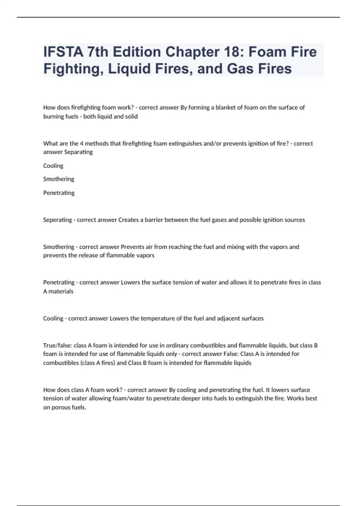 IFSTA 7th Edition Chapter 18: Foam Fire Fighting, Liquid Fires, and Gas FiresHow does firefighting foam work? - correct answer By forming a blanket of foam on the surface of burning fuels - both liquid and solid What are the 4 methods that firefighting foam extinguishes and/or prevents ignition of fire? - correct answer Separating Cooling Smothering Penetrating Seperating - correct answer Creates a barrier between the fuel gases and possible ignition sources Smothering - correct answer Prevents air from reaching the fuel and mixing with the vapors and prevents the release of flammable vapors Penetrating - correct answer Lowers the surface tension of water and allows it to penetrate fires in class A materials Cooling - correct answer Lowers the temperature of the fuel and adjacent surfaces True/false: class A foam is intended for use in ordinary combustibles and flammable liquids, but class B foam is intended for use of flammable liquids only - correct answer False: Class A is intended for combustibles (class A fires) and Class B foam is intended for flammable liquids How does class A foam work? - correct answer By cooling and penetrating the fuel. It lowers surface tension of water allowing foam/water to penetrate deeper into fuels to extinguish the fire. Works best on porous fuels. Class B foam is especially effective on what two basic categories of flammable liquids? - correct answer Hydrocarbon fuels and polar solvents How is finished foam produced? - correct answer A foam proportioner mixes foam concentrate and water to produce a foam solution. Air is then added to the solution through mechanical agitation, or aeration, to produce the finished foam. Removing any element results in no or poor quality foam. What is foam expansion? - correct answer The increase in volume of a foam solution when it is aerated - expansion is a key characteristic when choosing a foam for a specific application The degree of foam expansion depends on the following factors: - correct answer - Type of foam concentrate used - accurate proportioning - quality of foam concentrate (shelf life or storage conditions) - method of aeration and sizing of bubbles What is the ratio of low-expansion foam? - correct answer 20:1 What is the ratio of medium-expansion foam? - correct answer 20:1 to 200:1 What is the ratio of high-expansion foam? - correct answer 200:1 to 1000:1 Why is it important to thoroughly flush equipment after foam use? - correct answer Foam concentrates have solvent characteristics and are mildly corrosive Class A foam is a special formulation of hydrocarbon based surfactants. How do these surfactants function? - correct answer They reduce the surface tension of water in the foam solution, allowing better water penetration into the fuel How does aerated class A foam work? - correct answer Coats and insulates fuels, preventing pyrolysis and ignition of an adjacent fire.